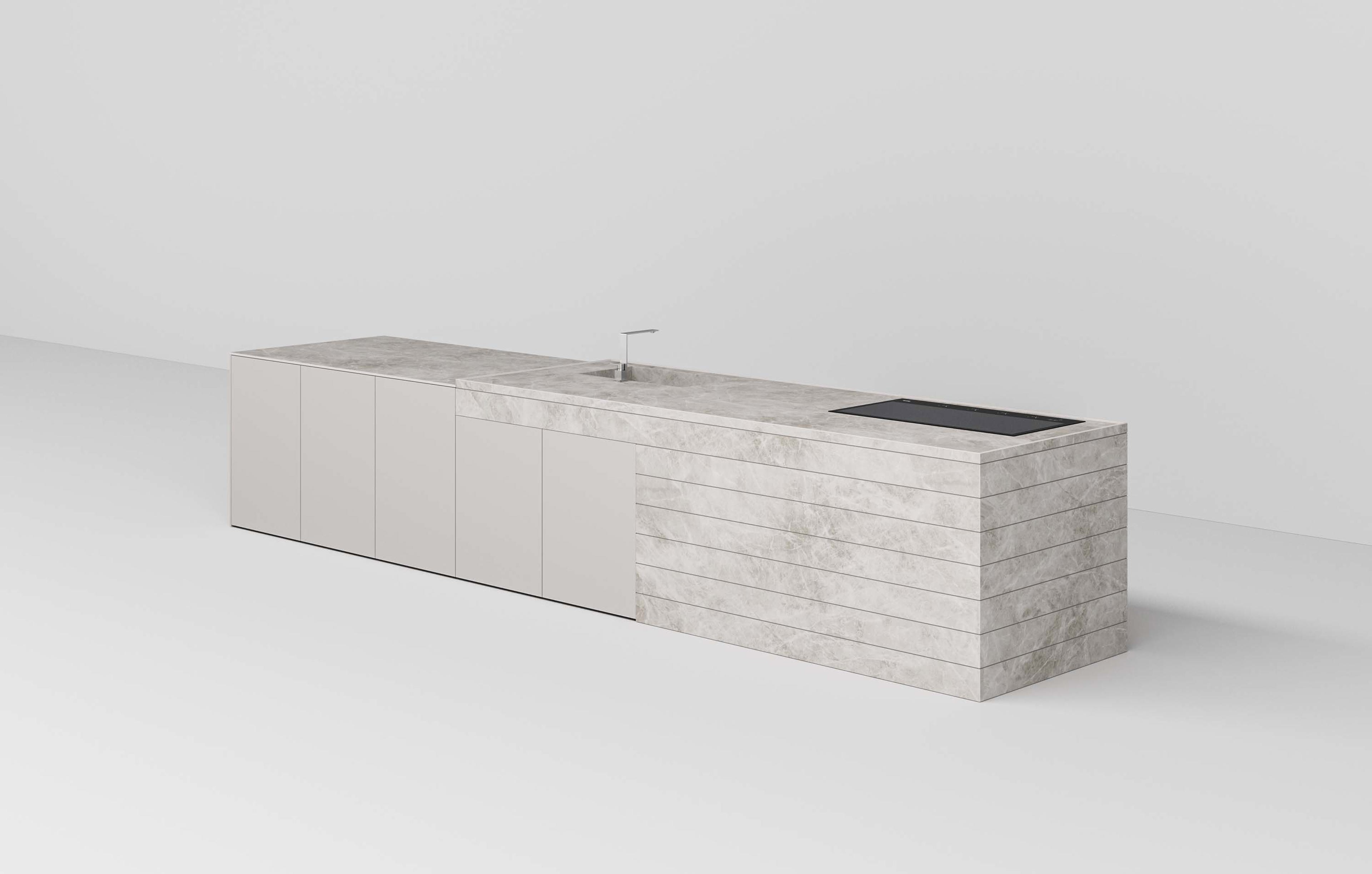 The Blocks System is available in stoneware, quartz and natural stone, and is characterised by the horizontal lines of the milling that create the characteristic slatted appearance.