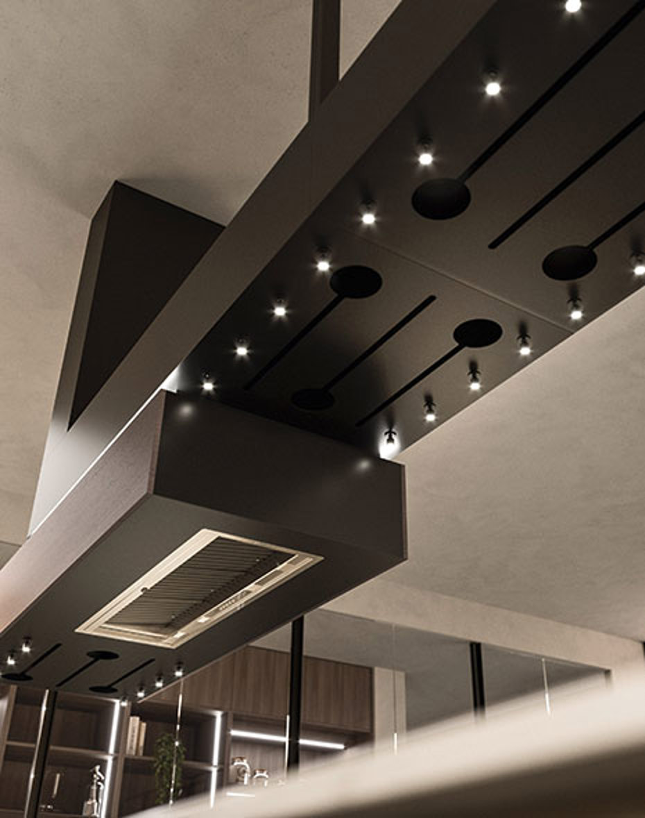 Thanks to its silhouettes and customised finish, the Domina hood, complements the design choices in open-plan environments.