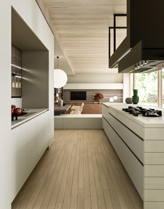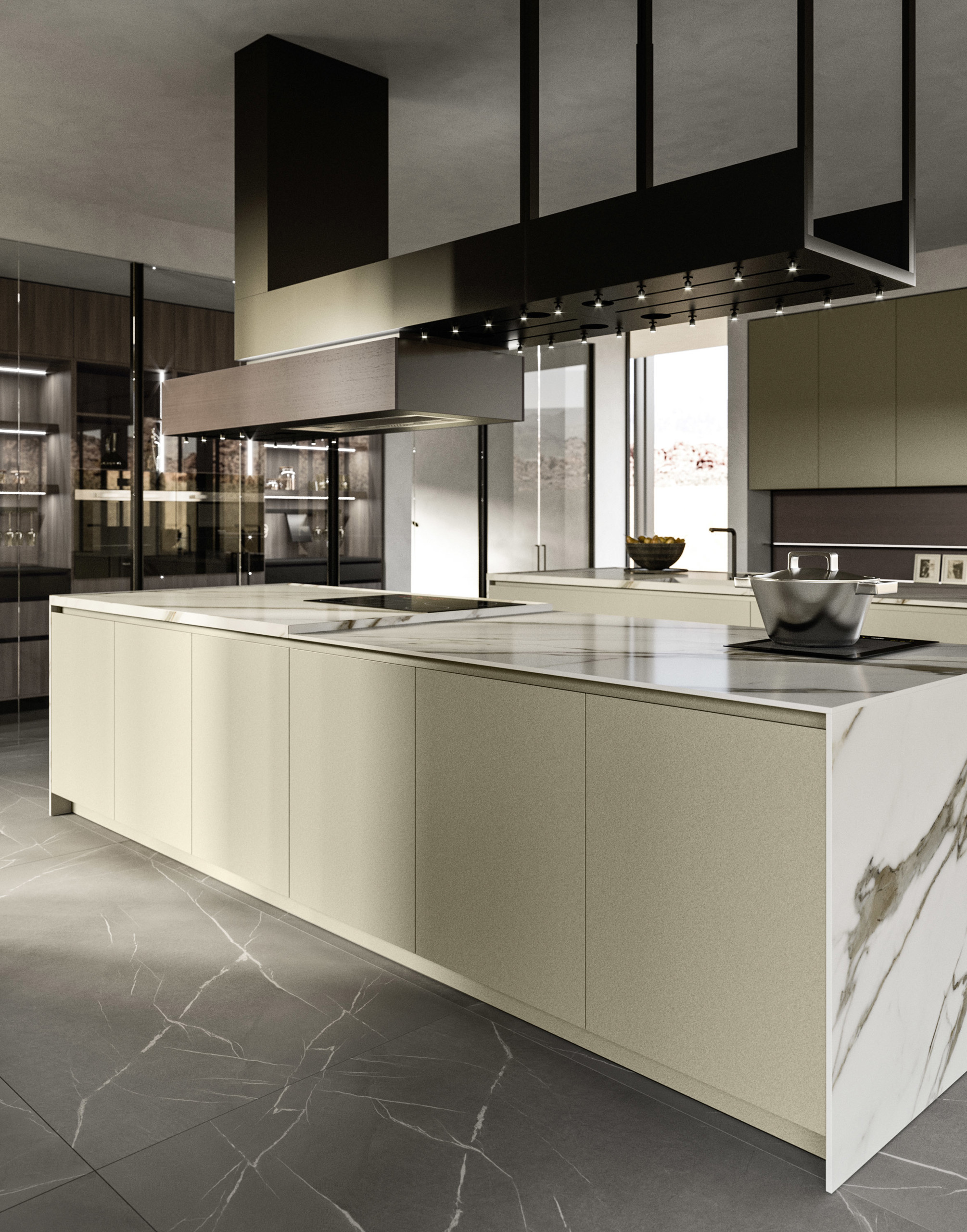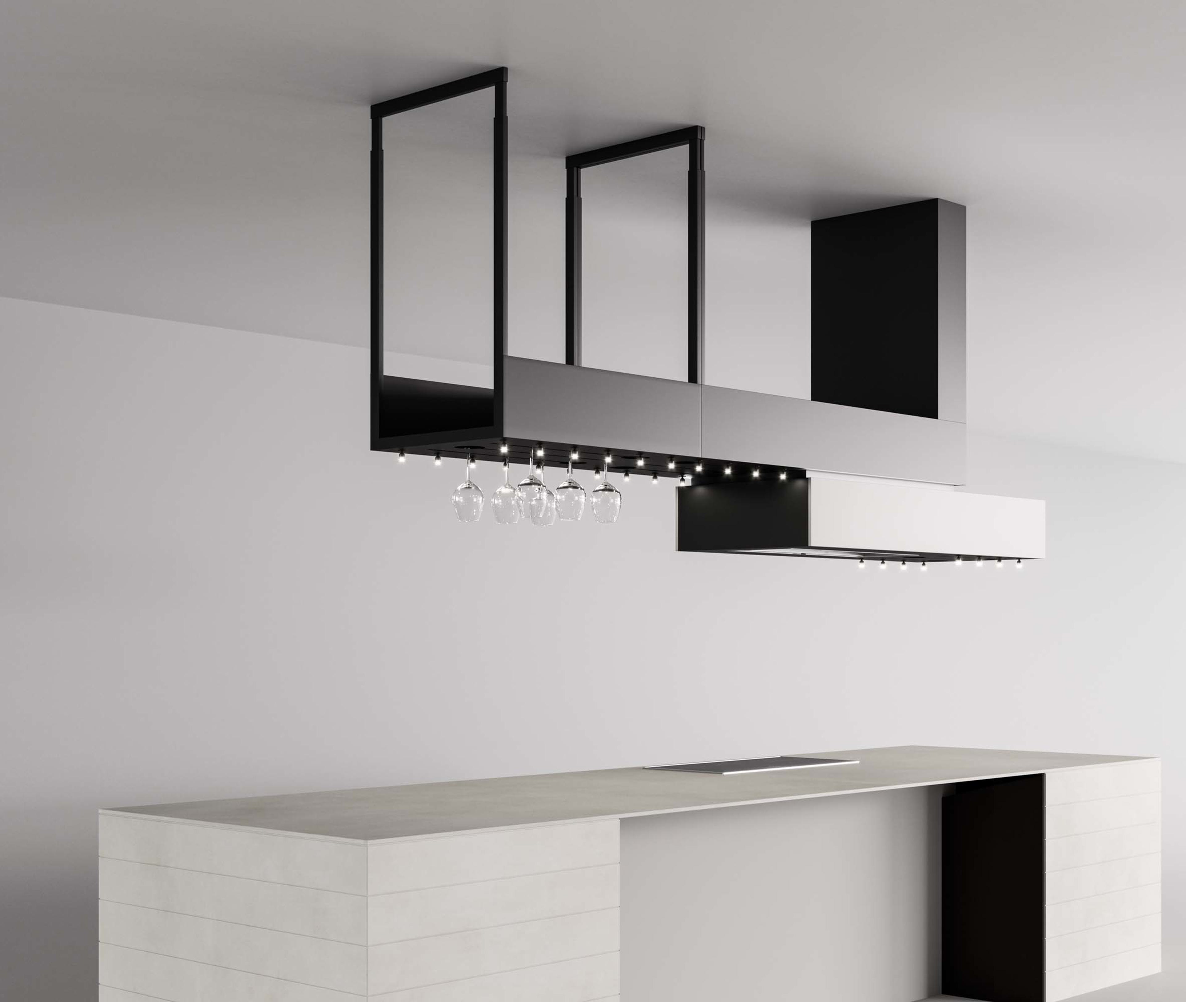 an additional structure into the hood element accessorised with wine glass racks and directional lights. The underside can be covered with panels to match the kitchen finishes.