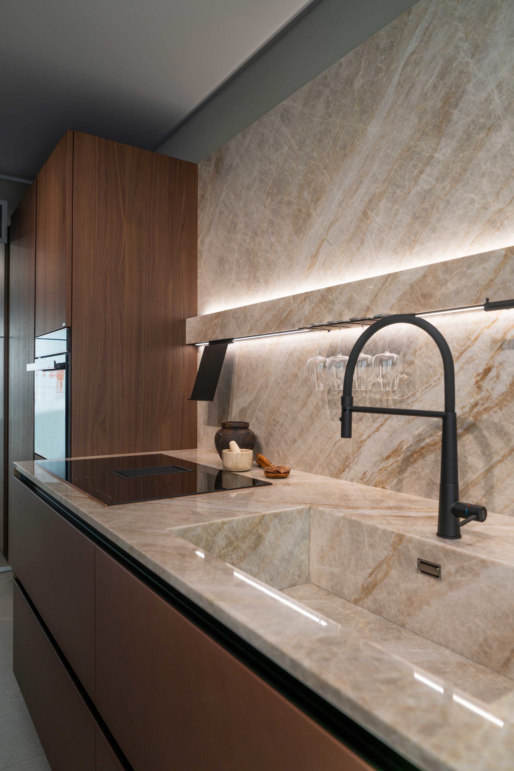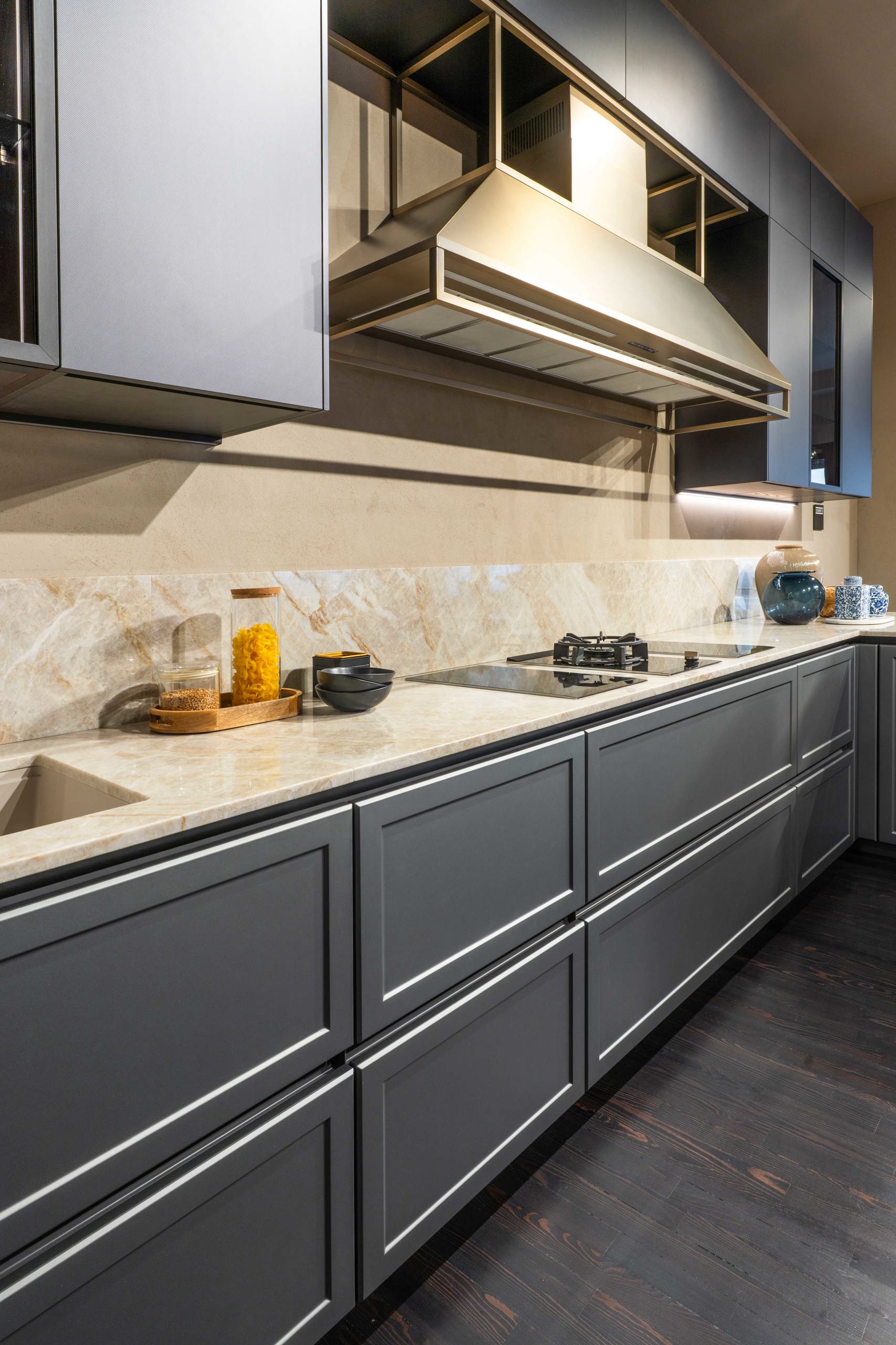 Une immersion dans l'innovation et la qualité Snaidero, l'univers Sistema et son extension vers le salon. La nouvelle finition tech metallic Titane Prismatique caractérise les meubles hauts de Frame.