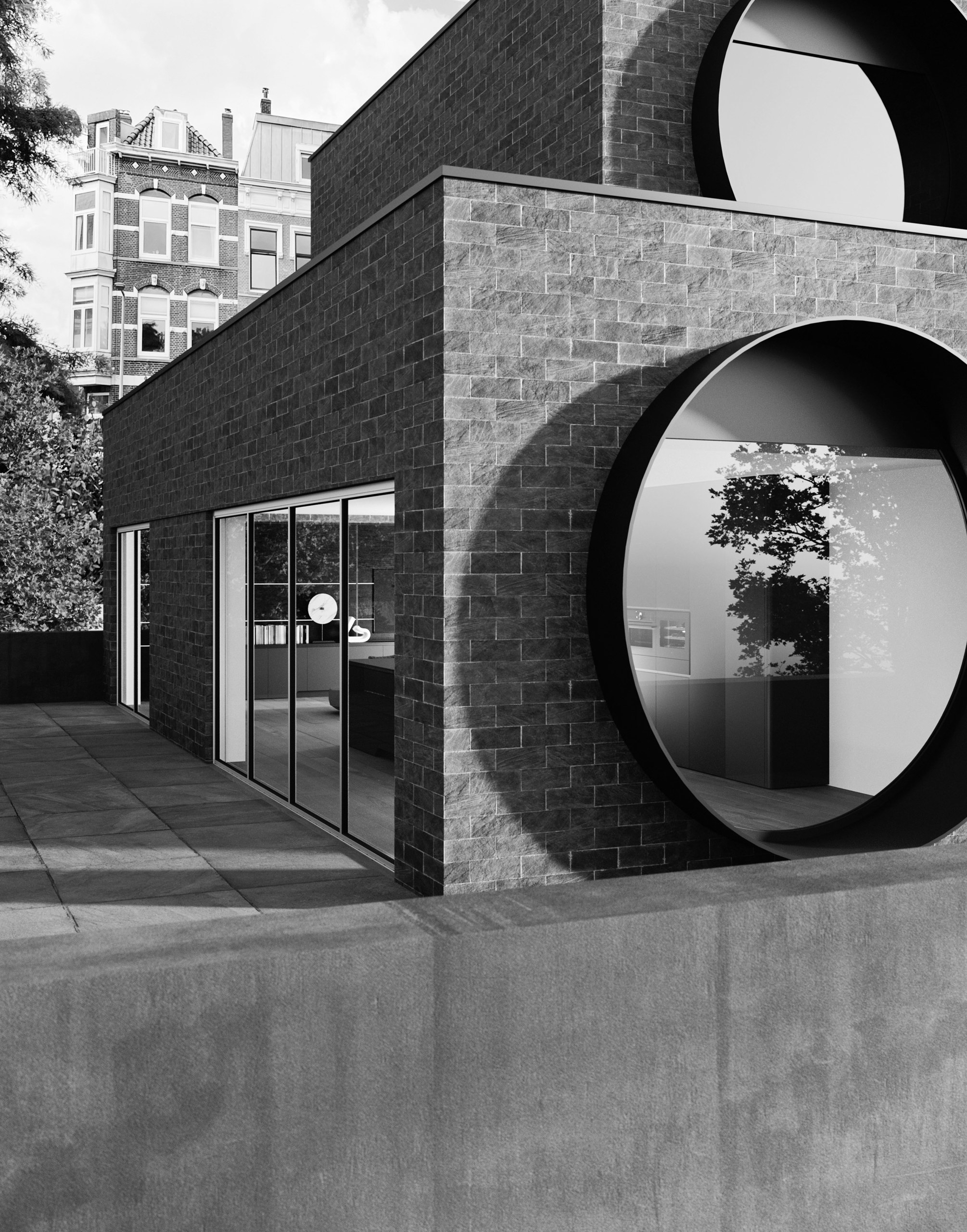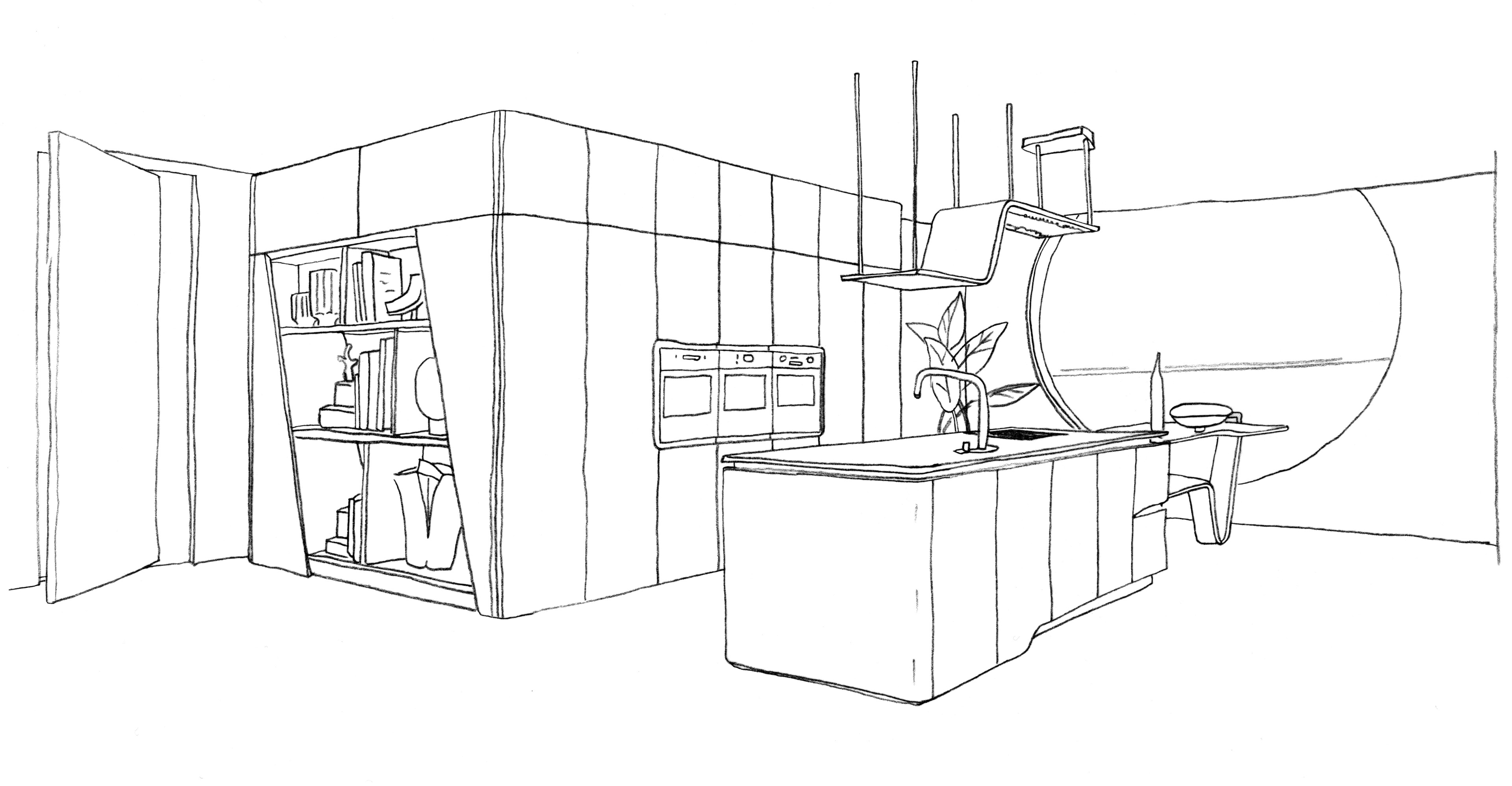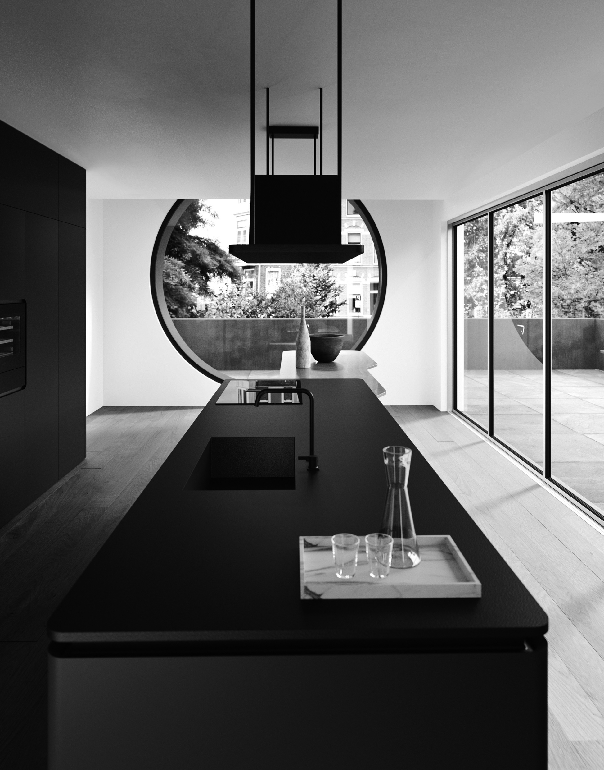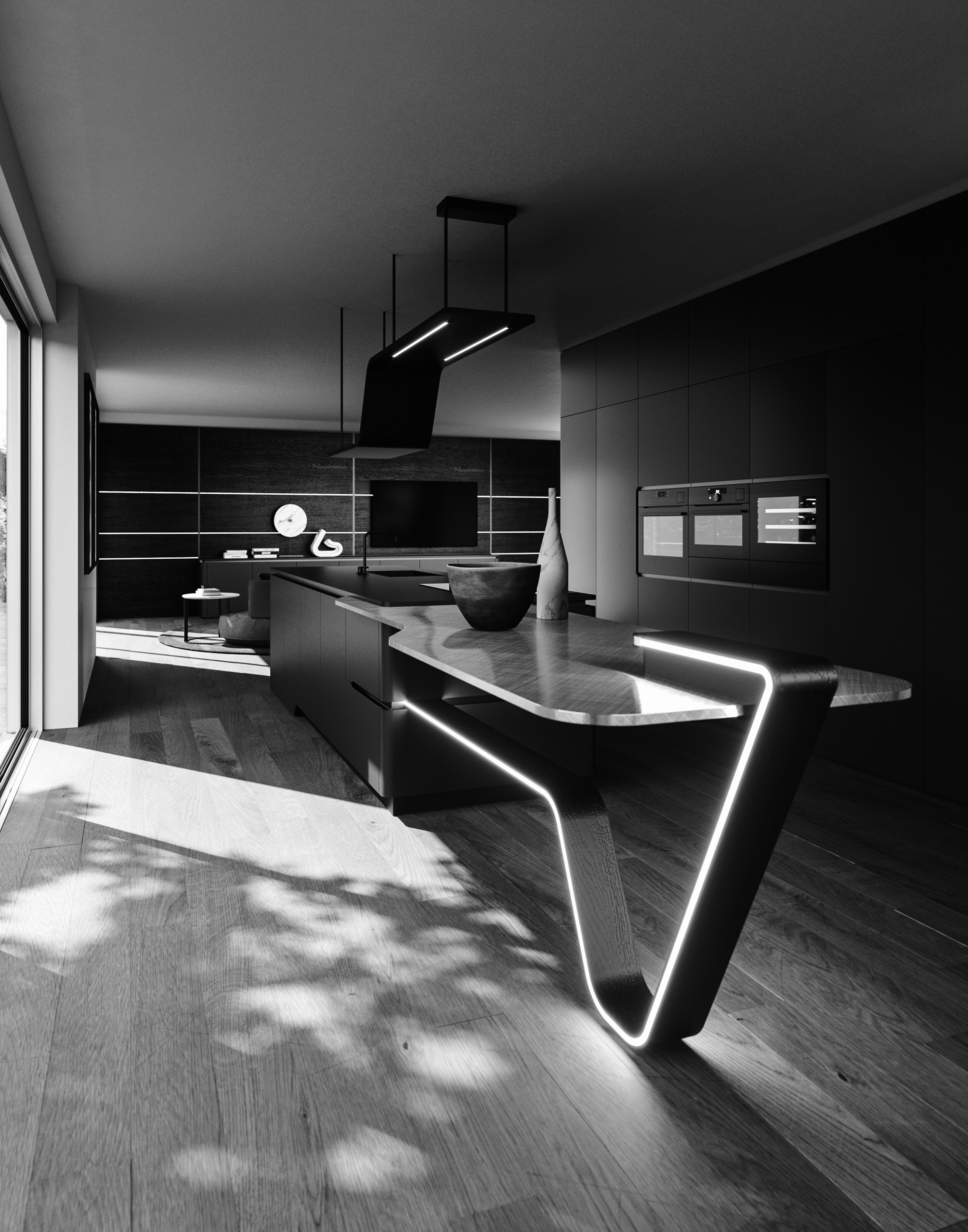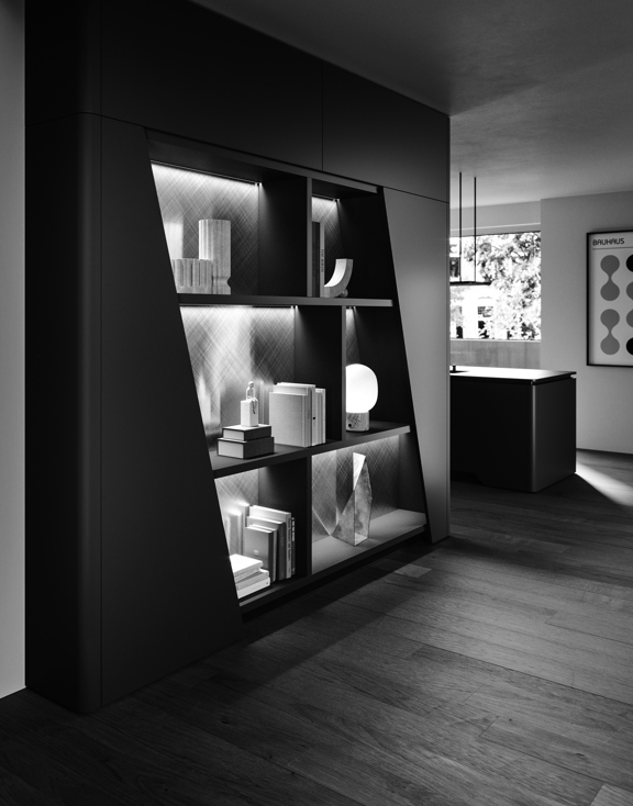 Vision si impone come protagonista dello spazio. Il nero, profondo e materico, definisce l’ambiente con un segno netto e riconoscibile: la gamba illuminata sostiene il piano snack trasformandolo in un punto di relazione e convivialità. Un progetto che supera la funzione per diventare gesto architettonico, integrando cucina e living in un unico spazio dal carattere iconico.