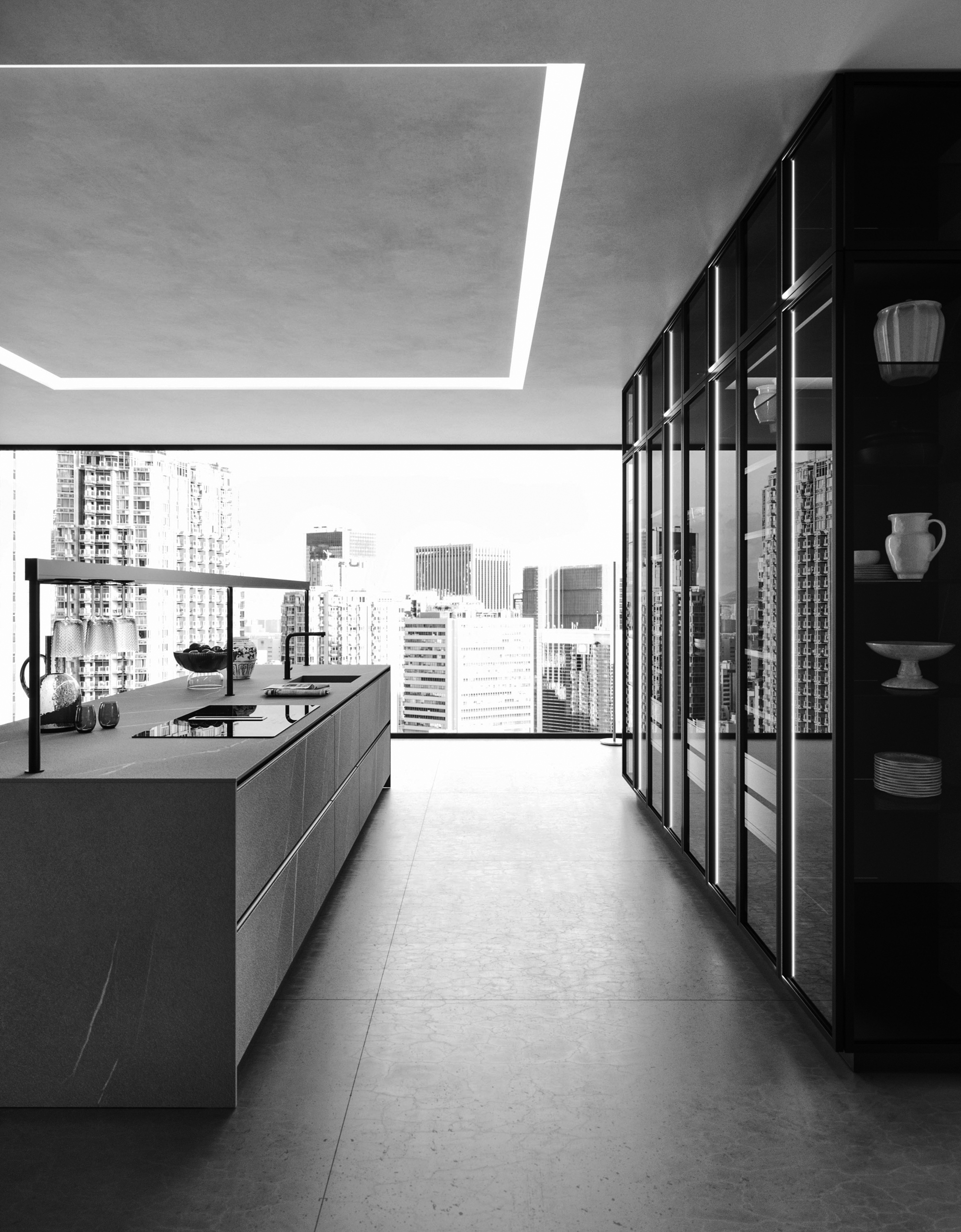 Al centro, un’isola dall’allure quasi mistico trasforma la cucina in un vero santuario domestico, accogliendo chi entra con eleganza e armonia. La sua finitura materica ne eleva la presenza, conferendo allo spazio un carattere distintivo, specchio della personalità di chi la vive ogni giorno.