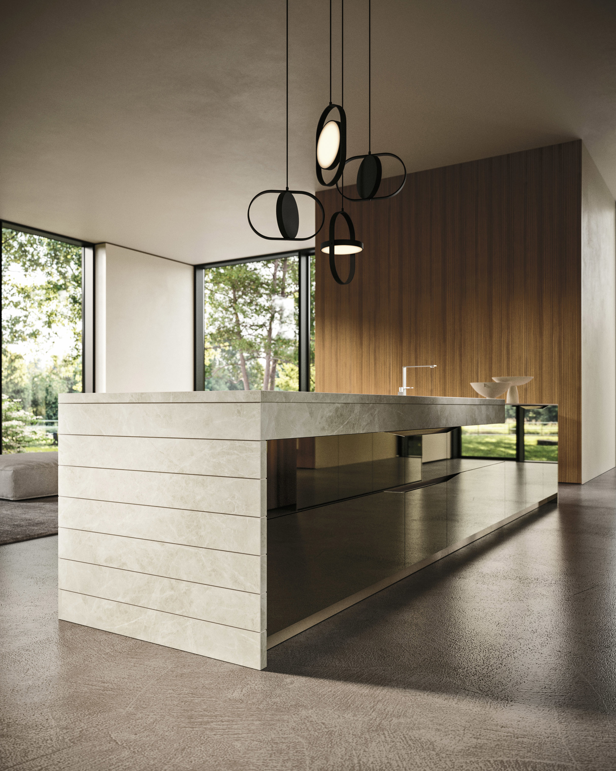La composizione premiata si caratterizza per un'isola centrale con ante in PVD Amalfi Specchiato che riflettono l'ambiente circostante dando vita a scenografie uniche.