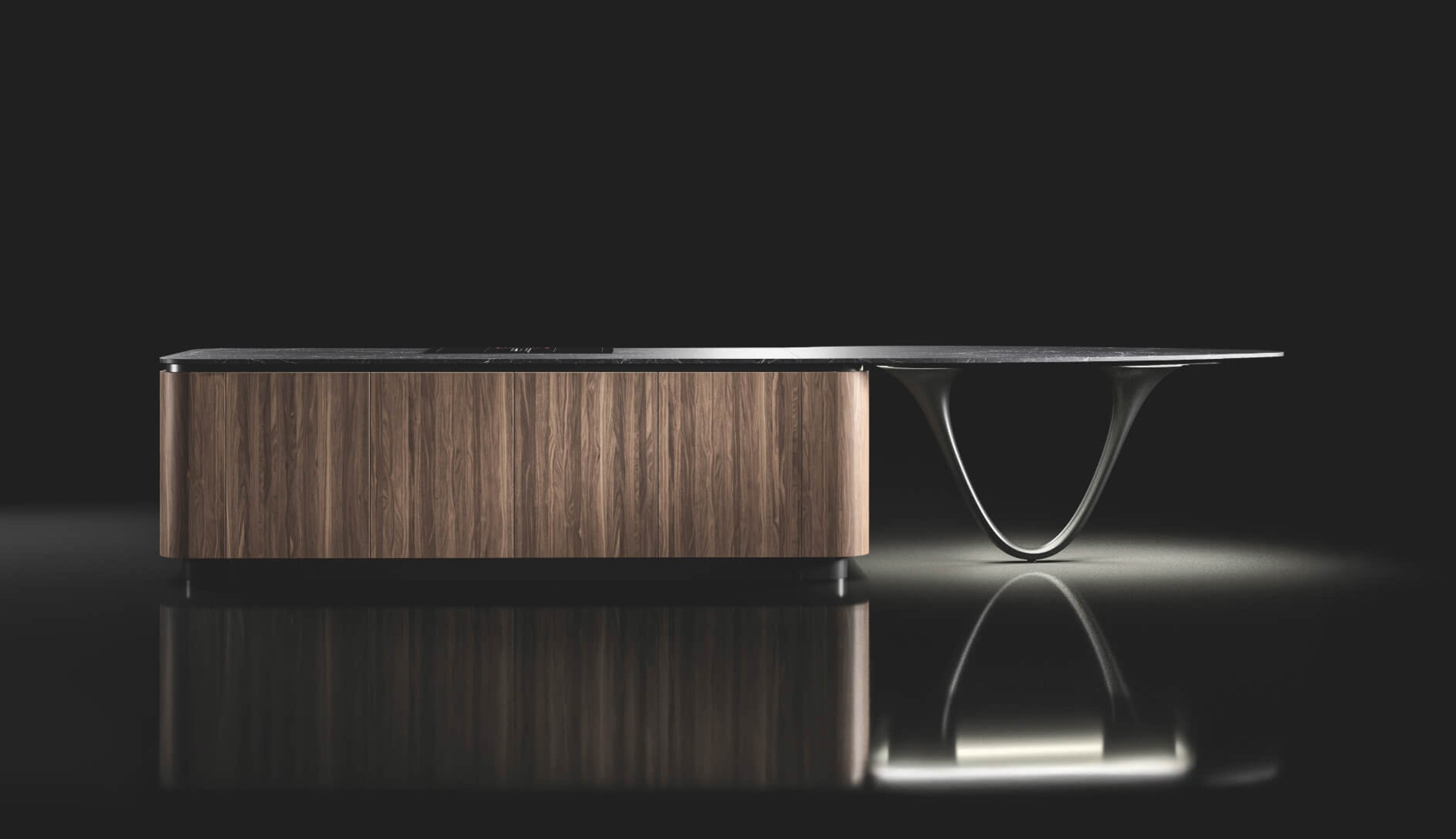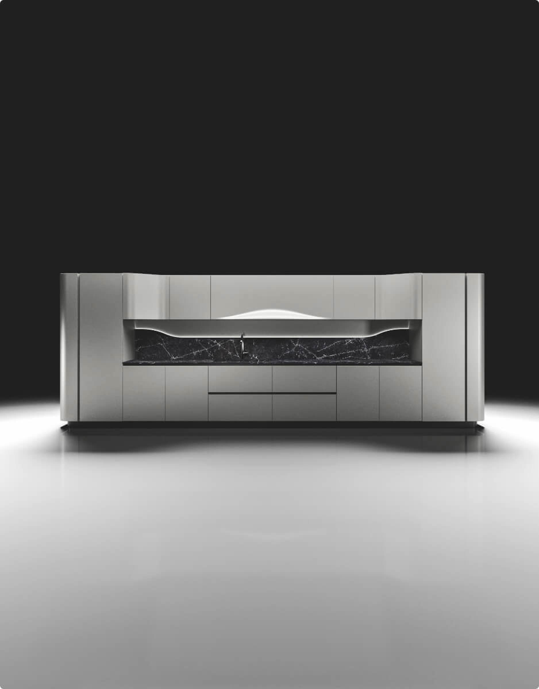 Le linee fluide della cucina Vision by Pininfarina evocano ergonomia, centralità della persona, emozione pura. Le sue superfici interpretano l'idea di cucina moderna con linee che scorrono senza soluzione di continuità.