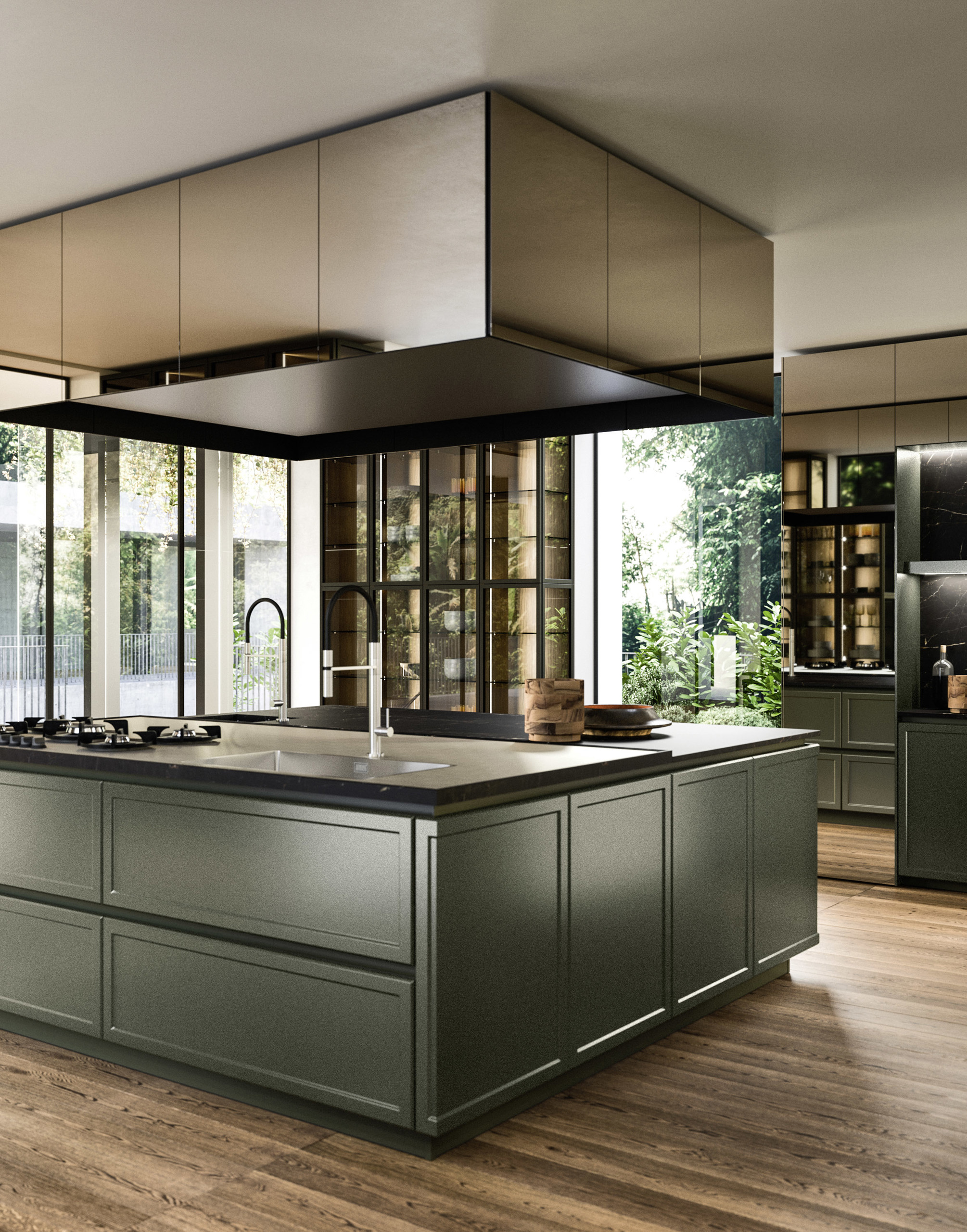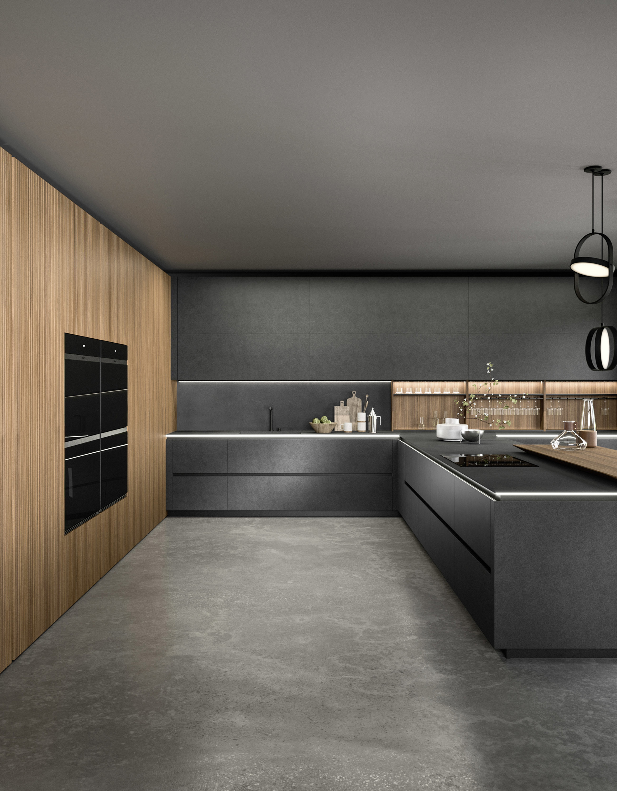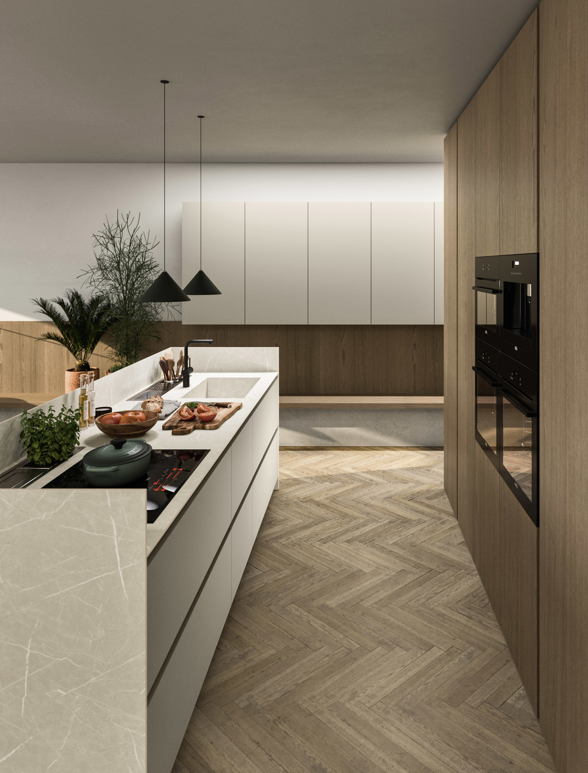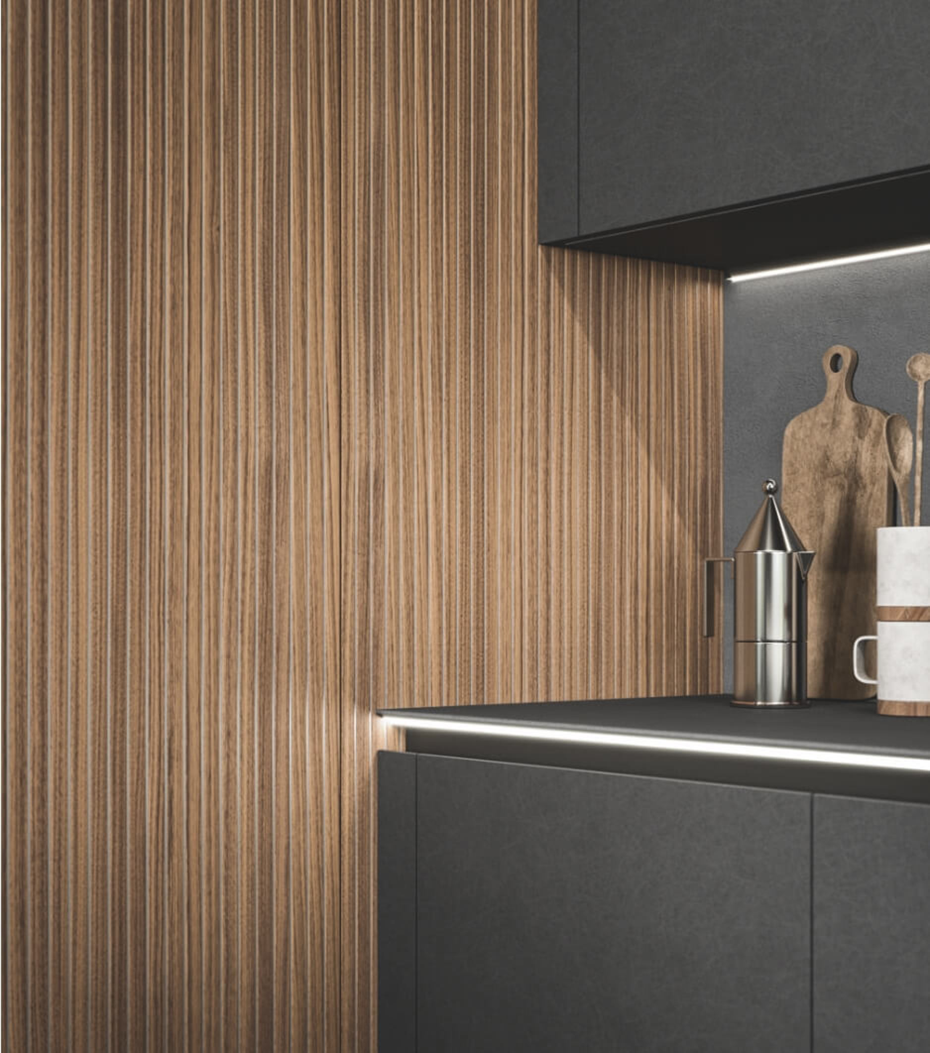 Trasversalità e progettazione: moduli, ante e componenti distintivi permettono di realizzare progetti di cucine moderne personalizzate e fortemente caratterizzati. L'ampia scelta di finiture rispecchia la personalità di chi vive l'ambiente.