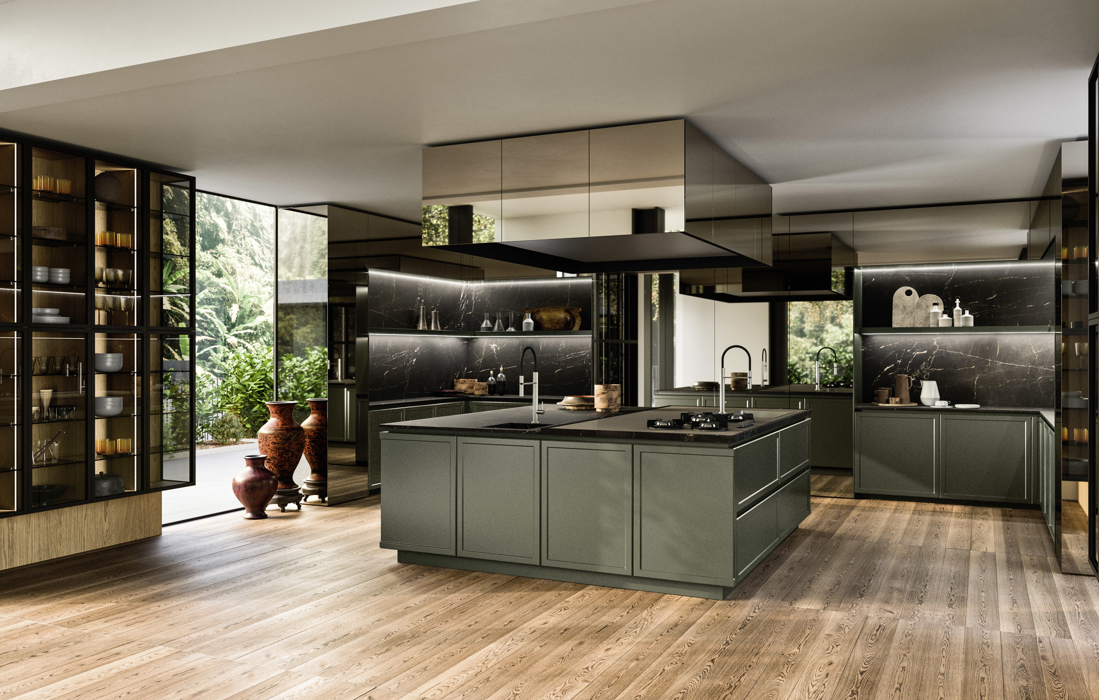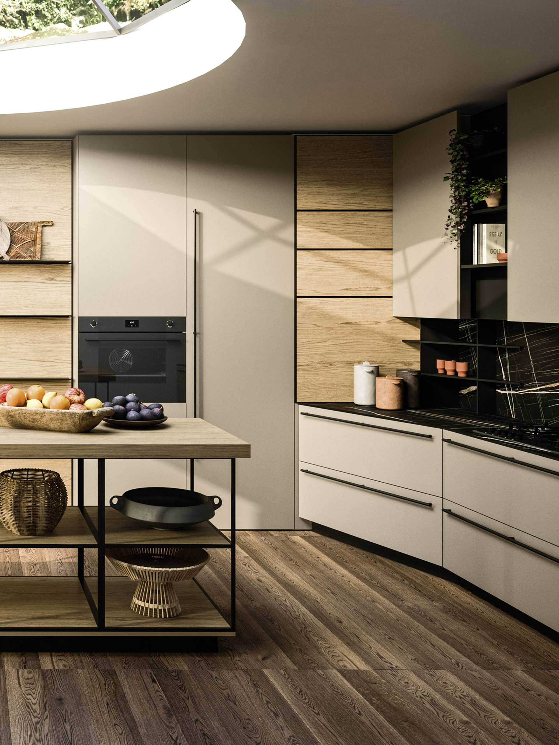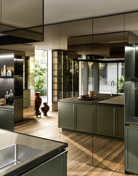 Spirito cosmopolita. Una cucina elegante e ricercata, ispirata a un gusto europeo ma attrezzata per soddisfare le esigenze culinarie di tutte le culture del mondo. La composizione è suddivisa in due aree: la cucina conviviale, caratterizzata da ante Frame, e la cucina operativa, definita dal componente distintivo Orbita. Le due zone dialogano tra loro in perfetta continuità estetica, unendo funzionalità e armonia materica.