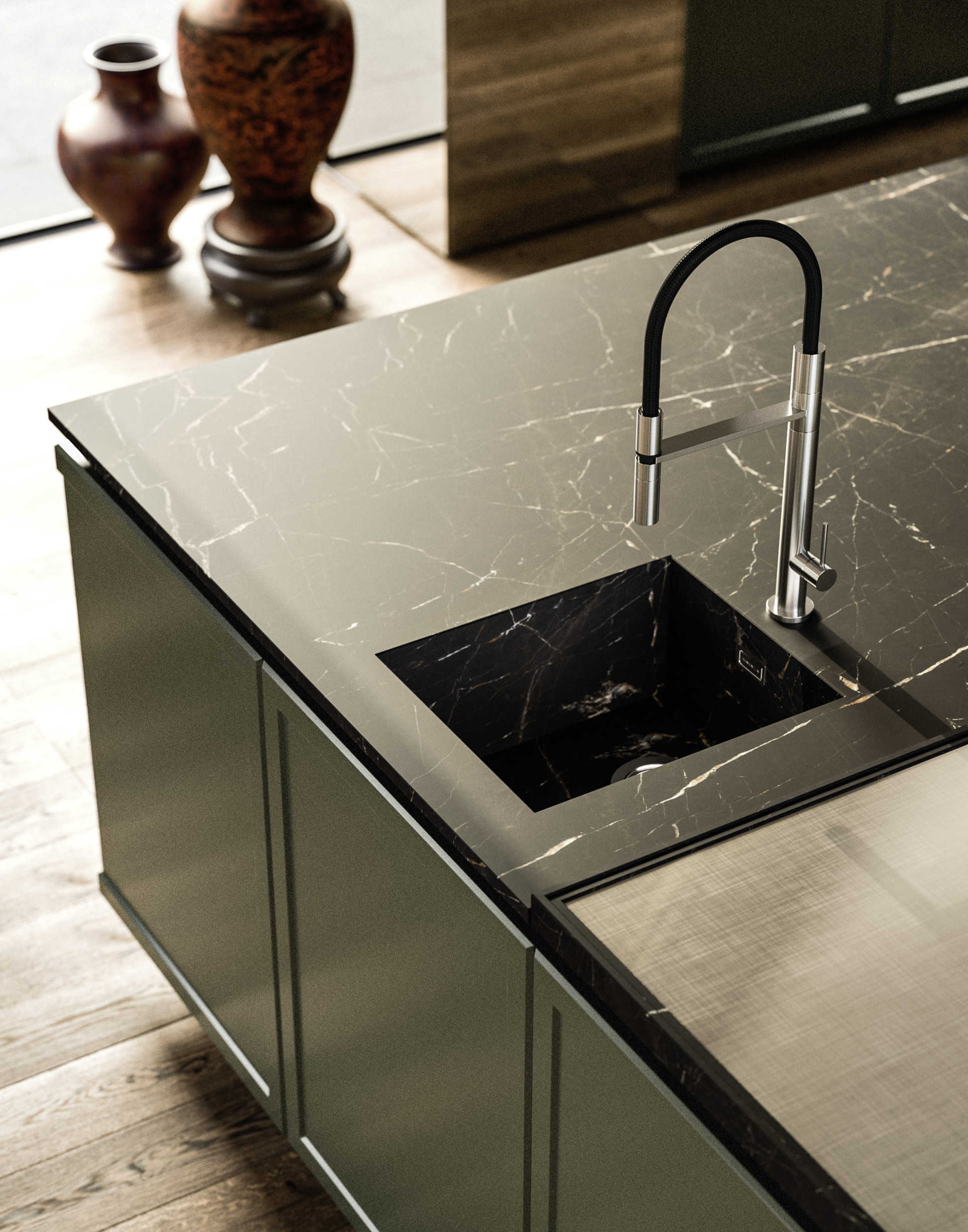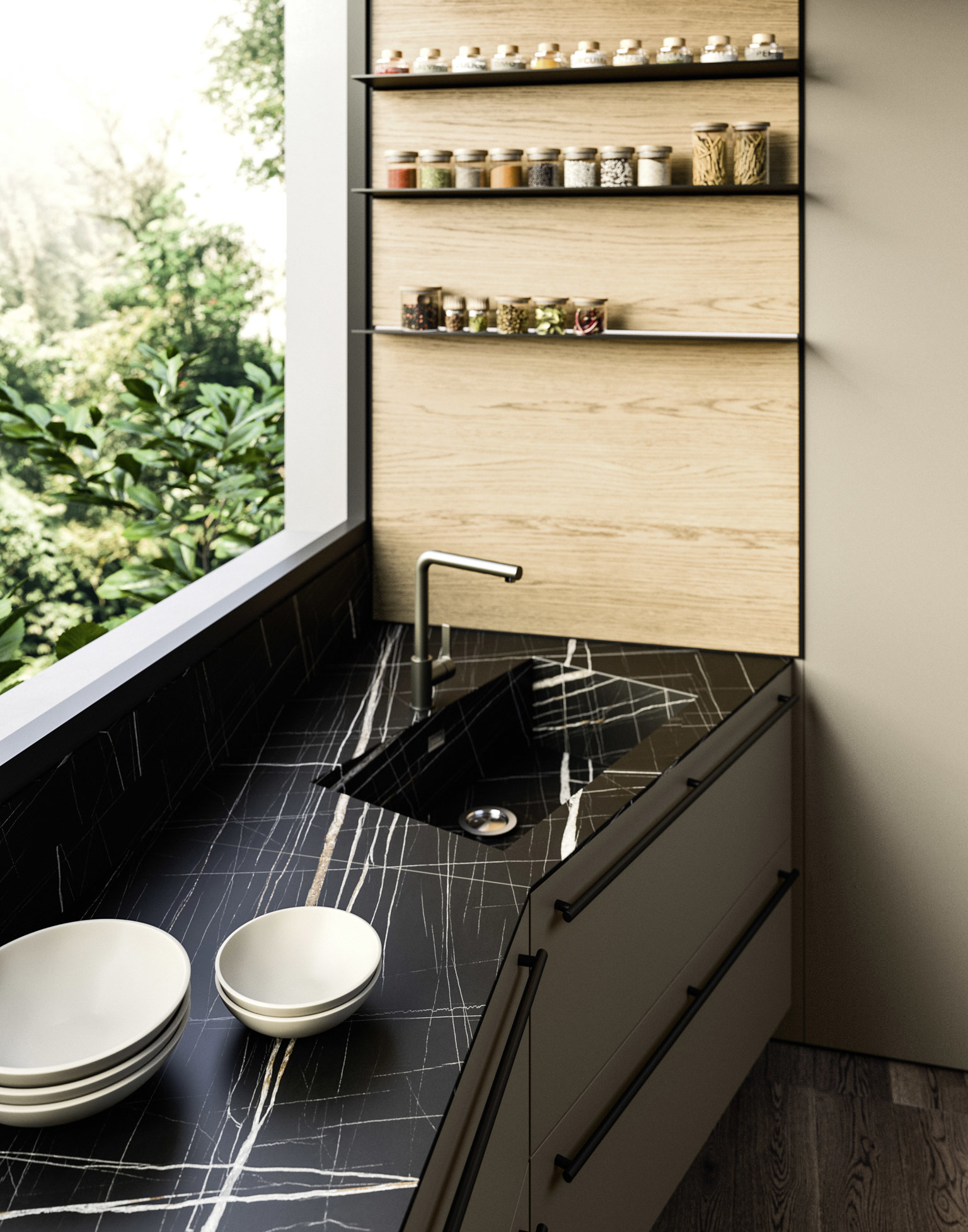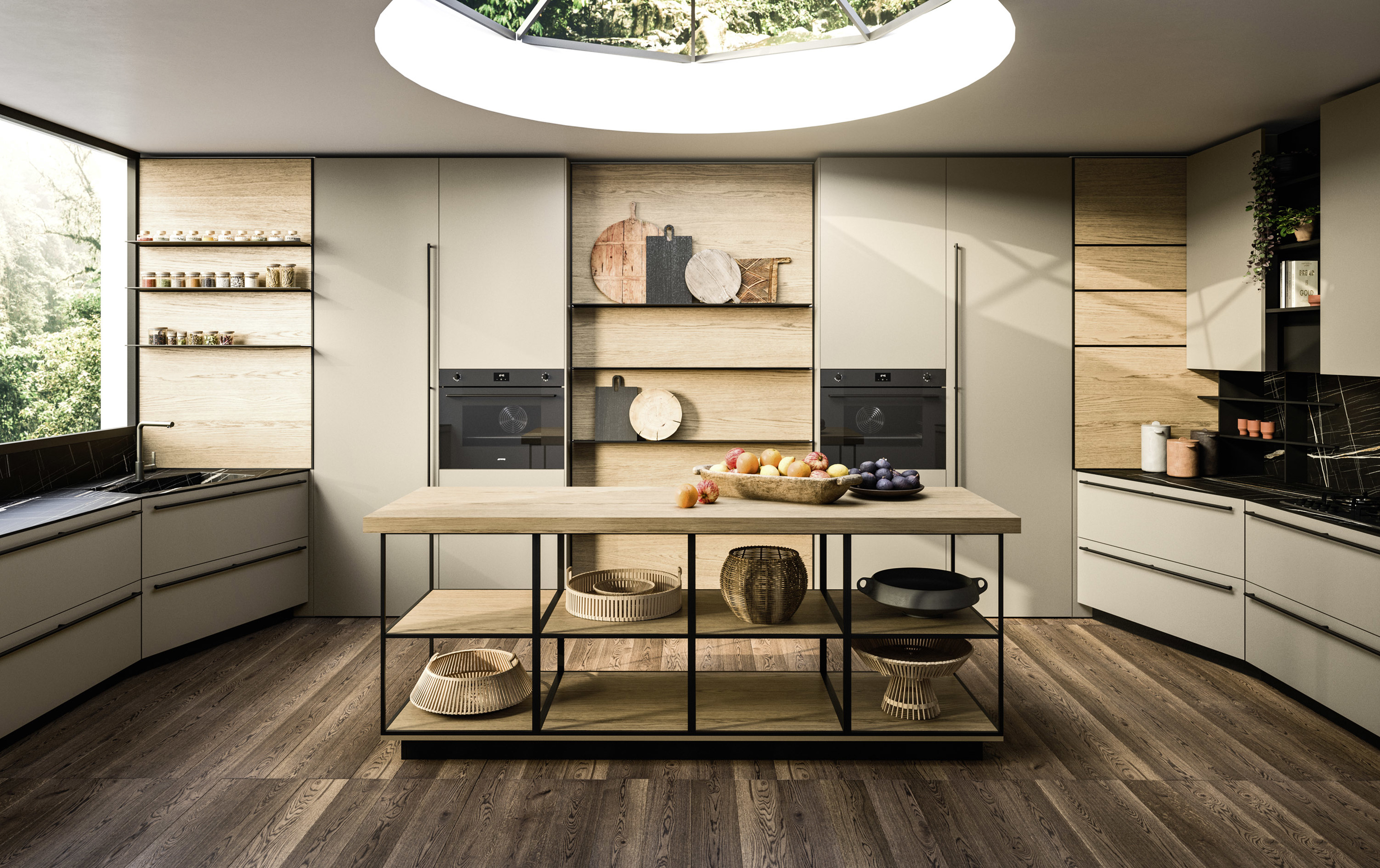 Spirito cosmopolita. Una cucina elegante e ricercata, ispirata a un gusto europeo ma attrezzata per soddisfare le esigenze culinarie di tutte le culture del mondo. La composizione è suddivisa in due aree: la cucina conviviale, caratterizzata da ante Frame, e la cucina operativa, definita dal componente distintivo Orbita. Le due zone dialogano tra loro in perfetta continuità estetica, unendo funzionalità e armonia materica.
