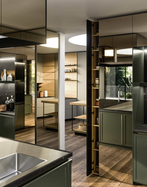 Colonne con ante Elementi in PVD Amalfi Specchiato con porte di passaggio Integra monodirezionali, che aprono il collegamento verso la cucina più operativa.