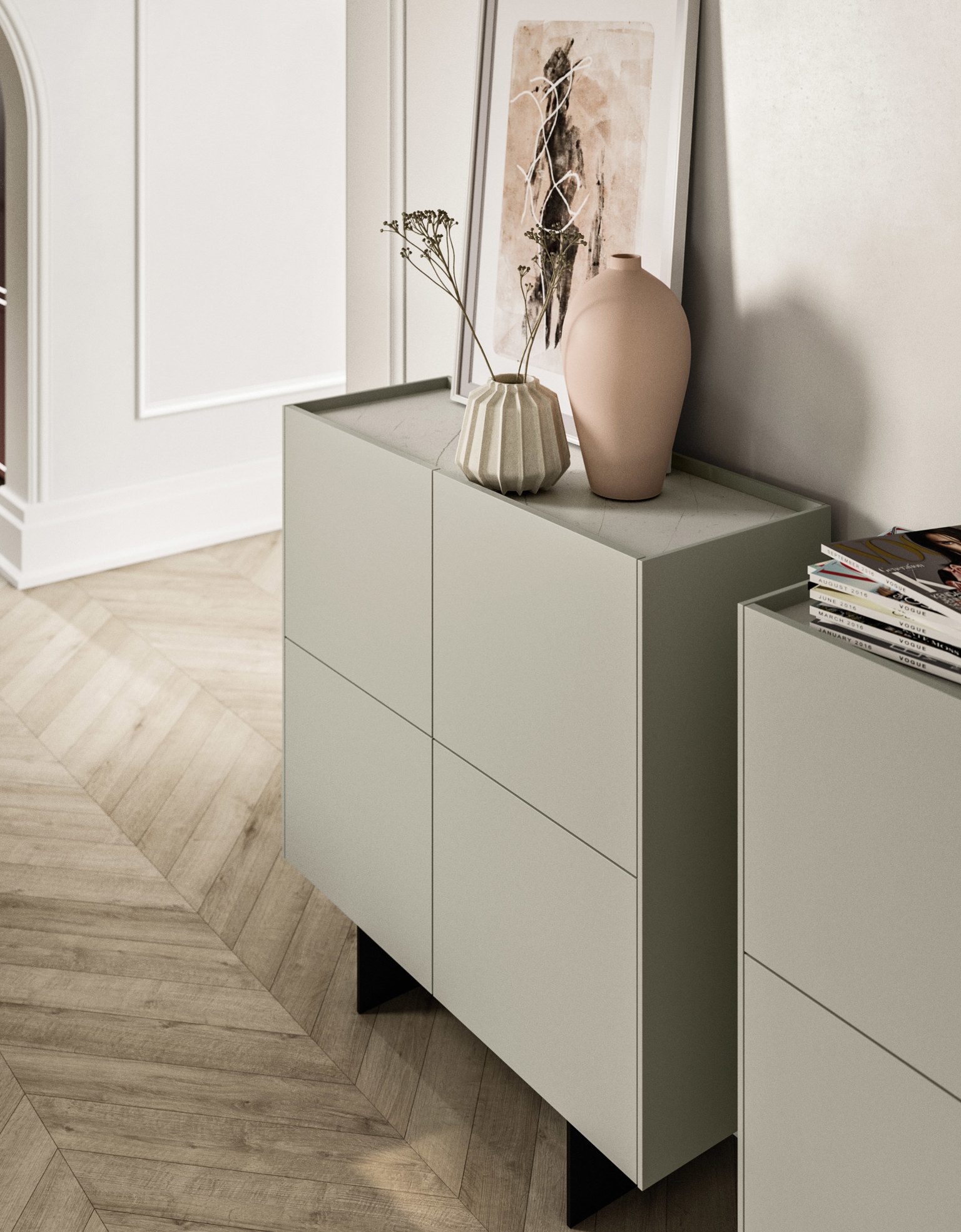 L’ambiente cucina dialoga armoniosamente con il living, dove le madie Modula by Andreucci & Hoisl Design contribuiscono a creare continuità materica e formale.