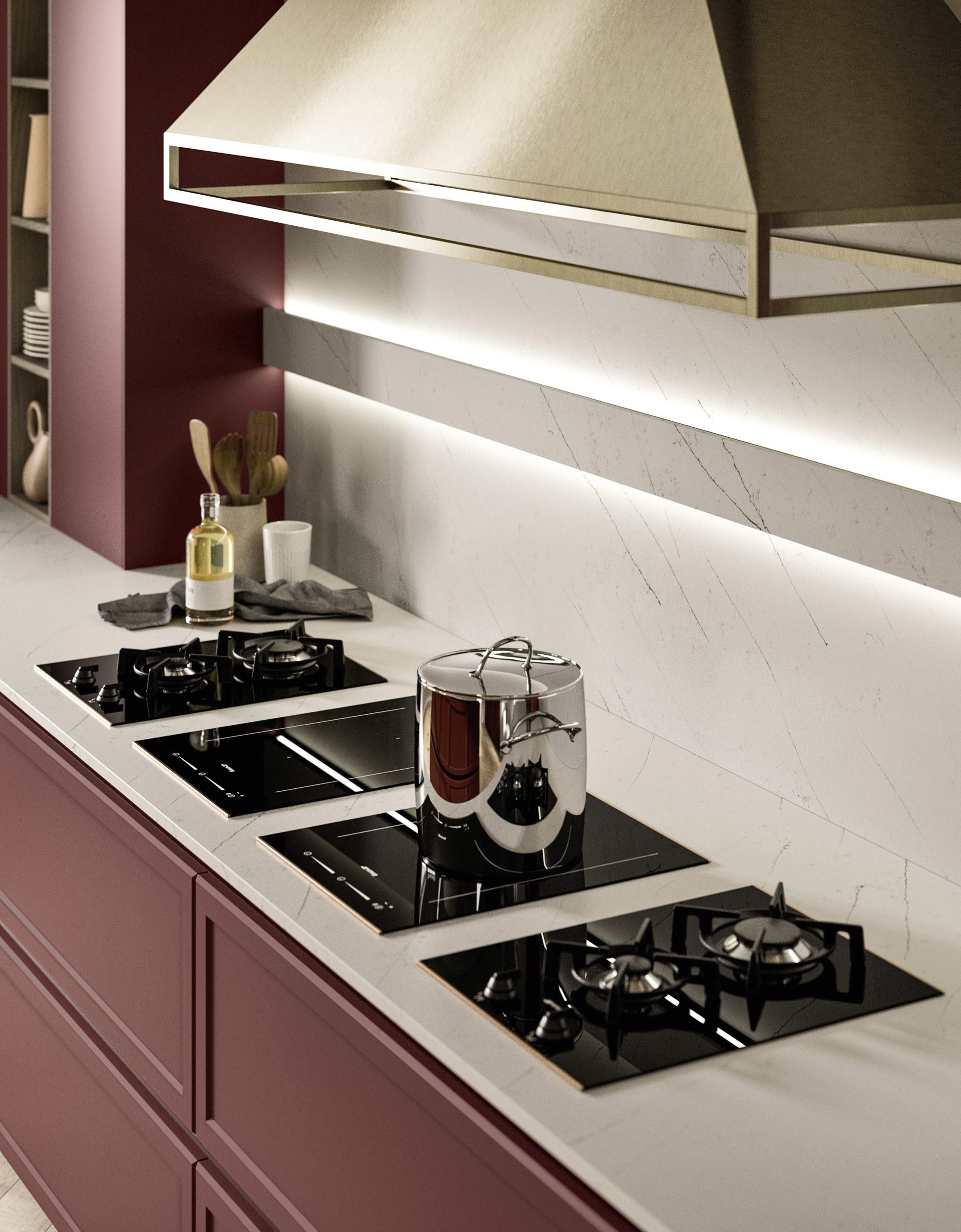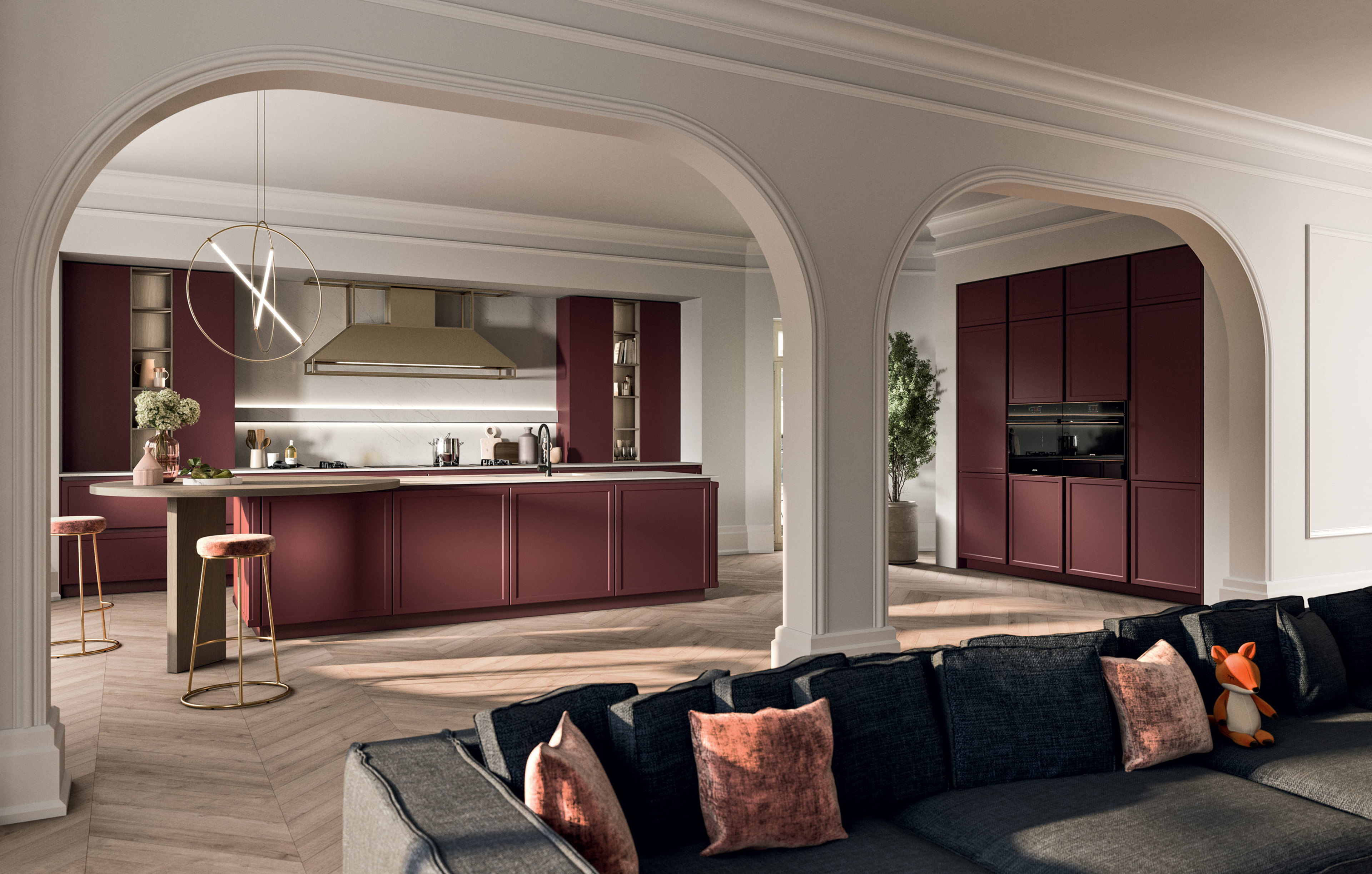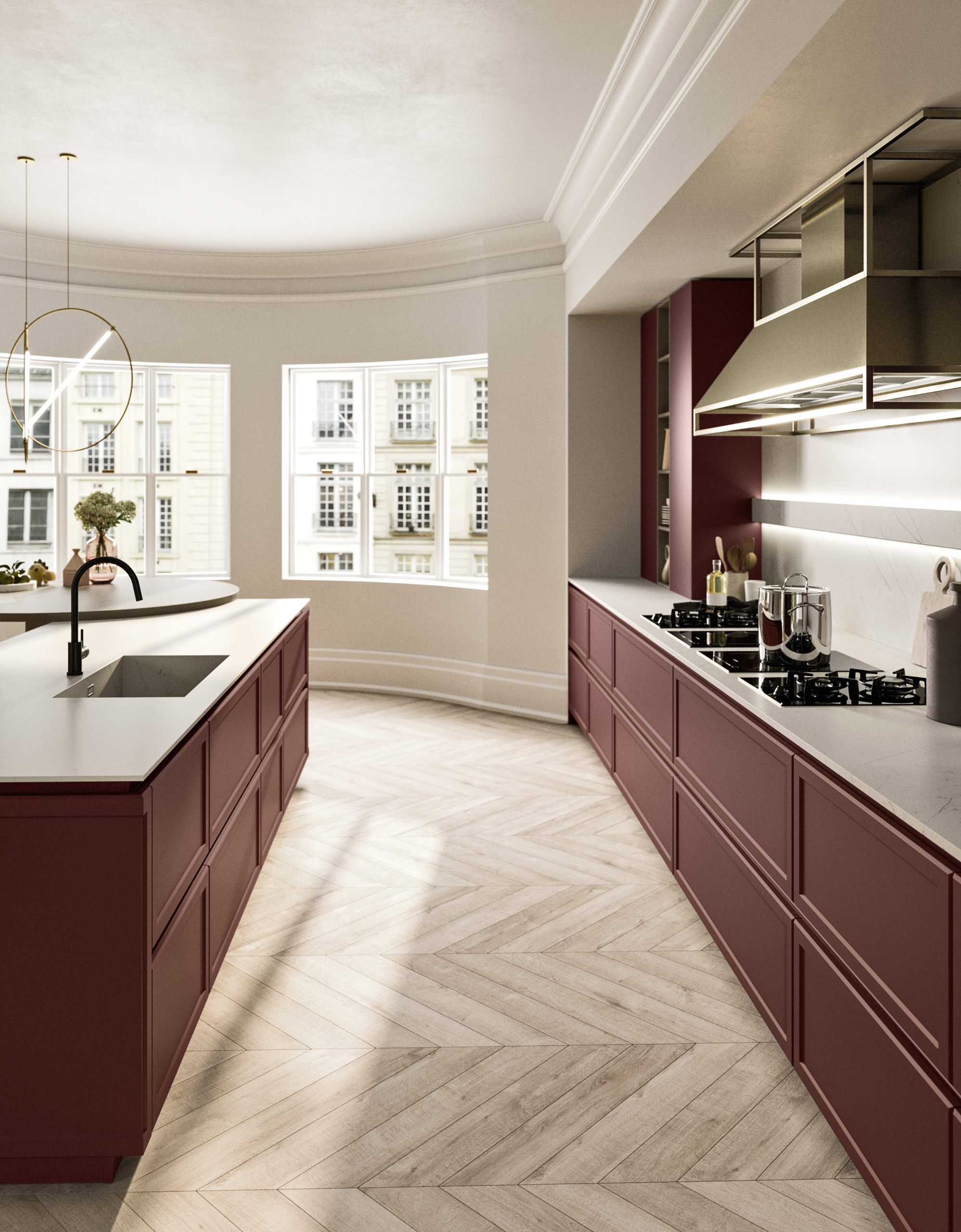 Ispirazioni Haute Couture. La cucina lineare con anta Frame by Iosa Ghini Design è completata da un’ampia isola centrale e da un piano snack rotondo, fulcro operativo e conviviale dello spazio. La composizione integra colonne funzionali e si sviluppa in continuità con il living, creando un dialogo armonico tra le aree. L’organizzazione speculare delle zone operative ottimizza i flussi di lavoro, unendo estetica ricercata e comfort quotidiano.