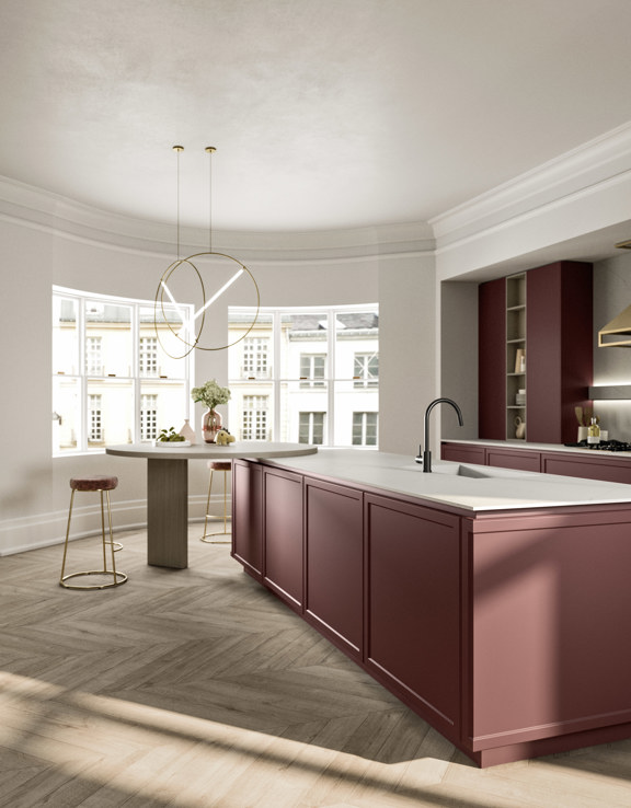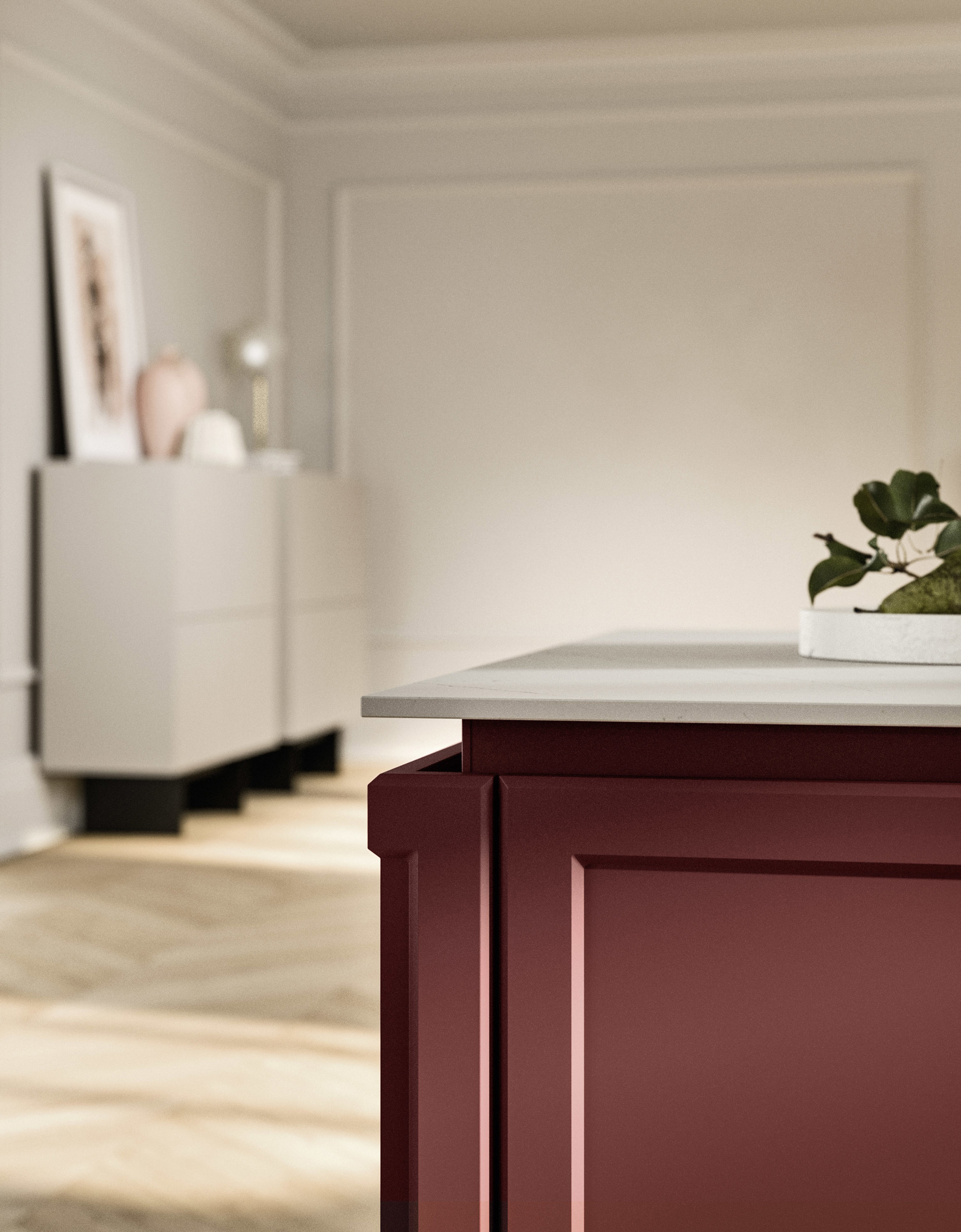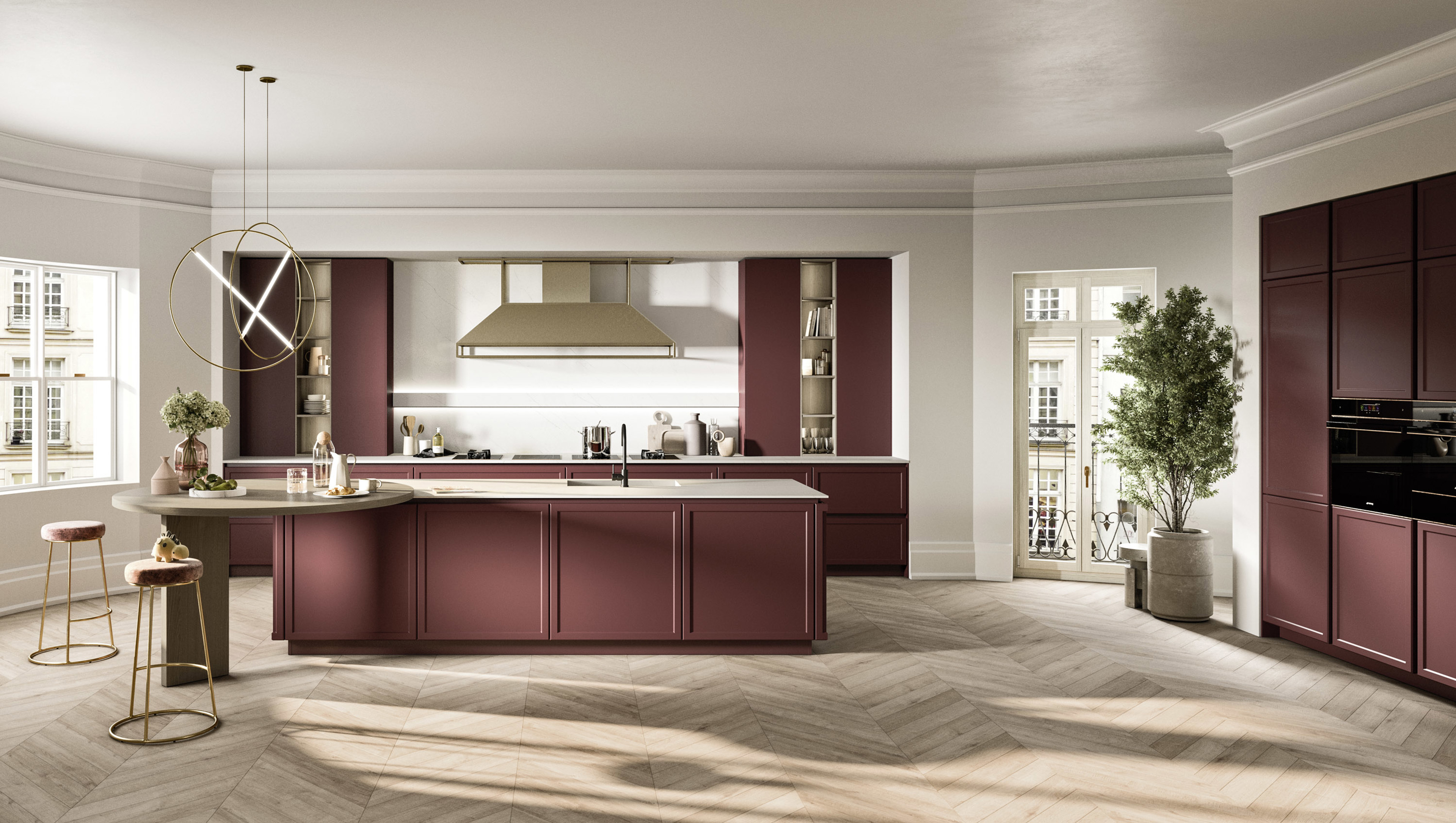 Ispirazioni Haute Couture. La cucina lineare con anta Frame by Iosa Ghini Design è completata da un’ampia isola centrale e da un piano snack rotondo, fulcro operativo e conviviale dello spazio. La composizione integra colonne funzionali e si sviluppa in continuità con il living, creando un dialogo armonico tra le aree. L’organizzazione speculare delle zone operative ottimizza i flussi di lavoro, unendo estetica ricercata e comfort quotidiano.