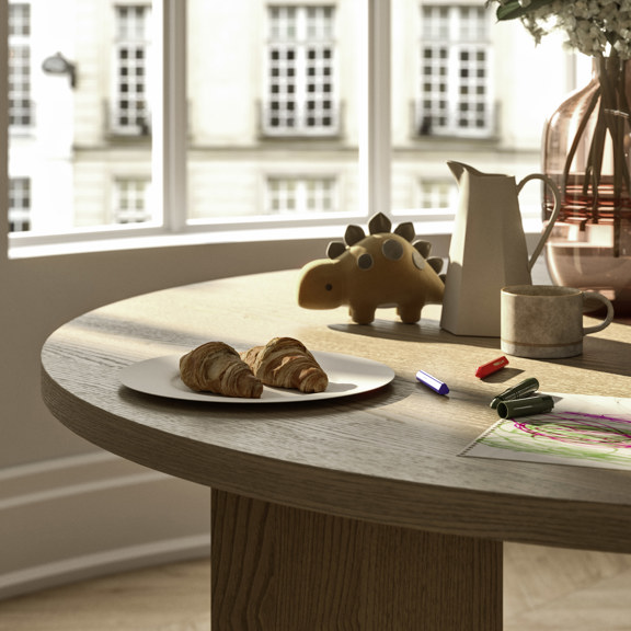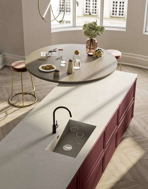Piano di lavoro in quarzo opaco Planet Interstellar Cloud con piano snack Plana in impiallacciato Eucalipto Ossidato