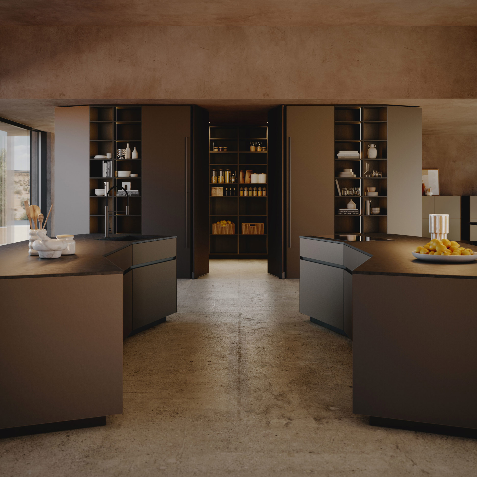 L'ampia gamma di finiture permette di personalizzare le porte integra adattandole agli ambienti, creando anche soluzioni scenografiche con le finiture speciali come questa proposta in PVD Amalfi Specchiato.