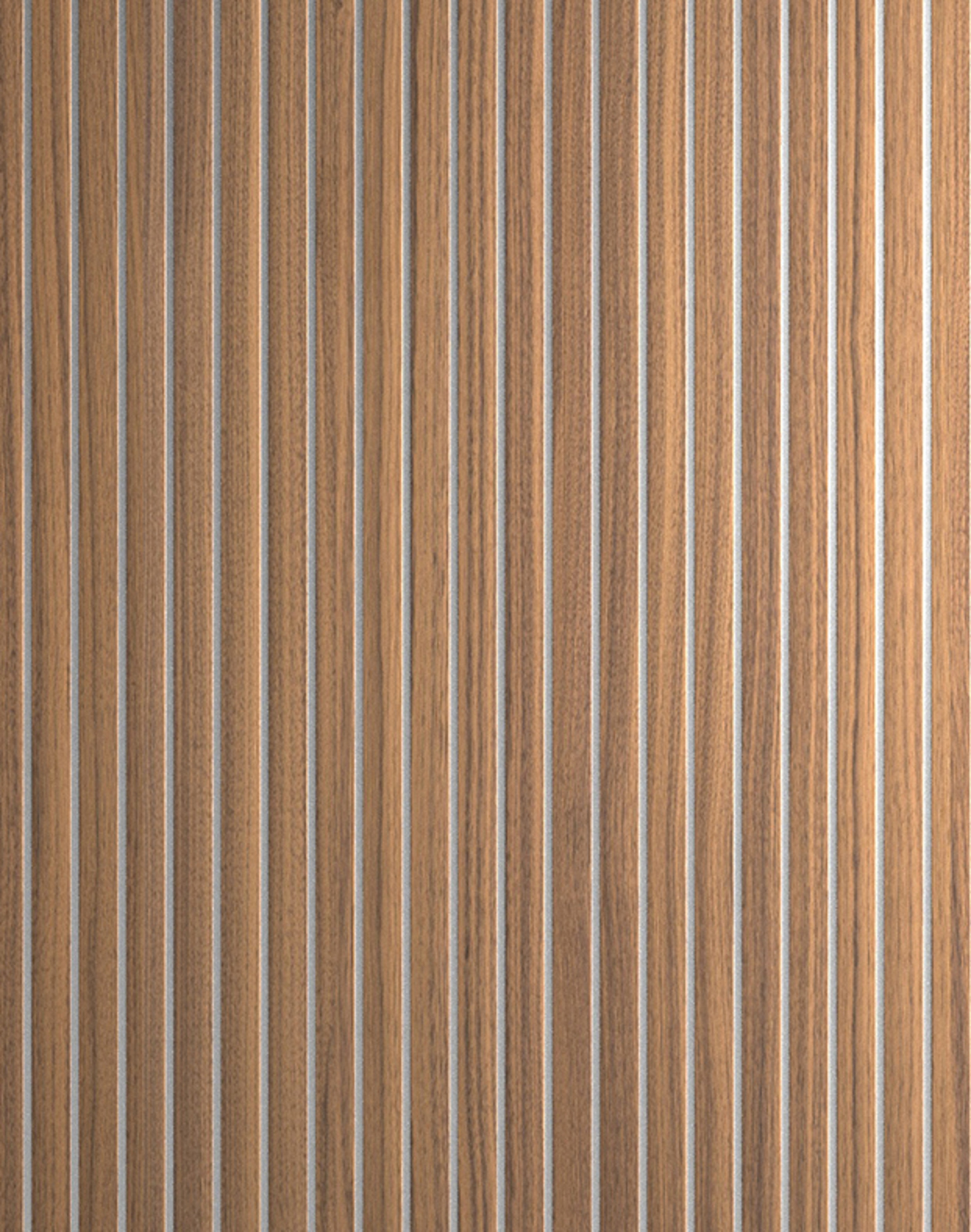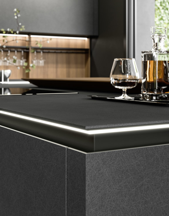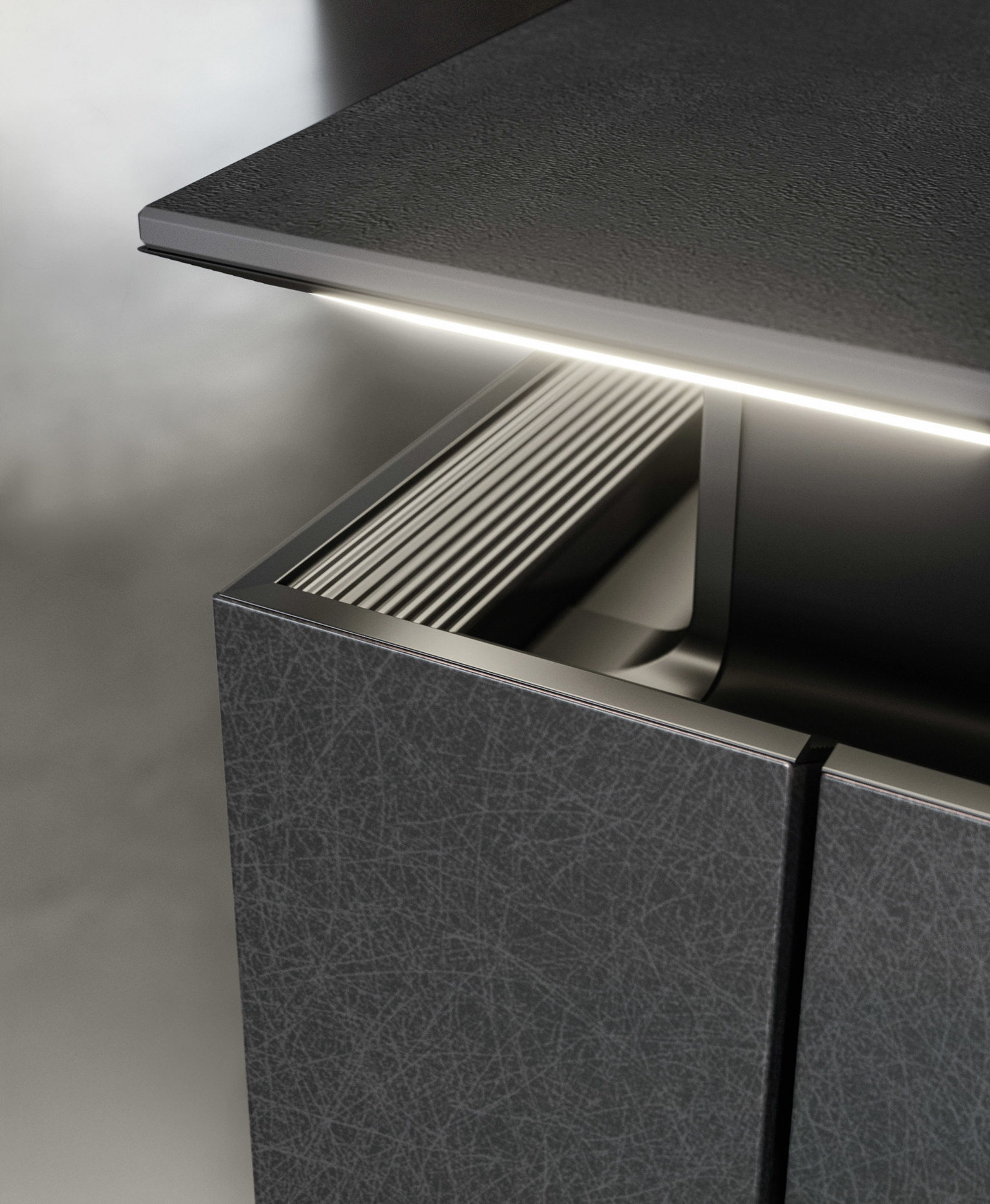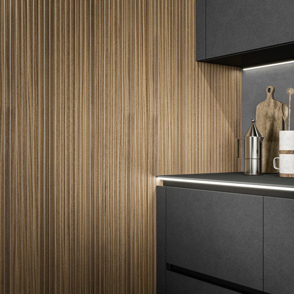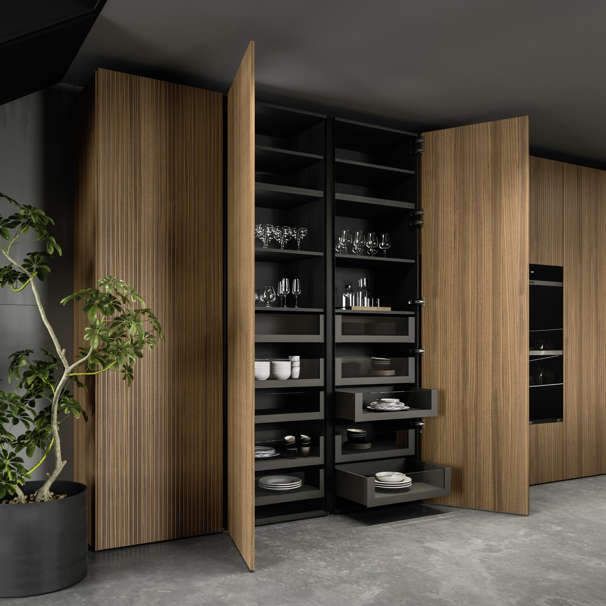 Elemento discreto ma distintivo, il piano snack a 30° in impiallacciato legno Noce Europeo arricchisce la composizione.