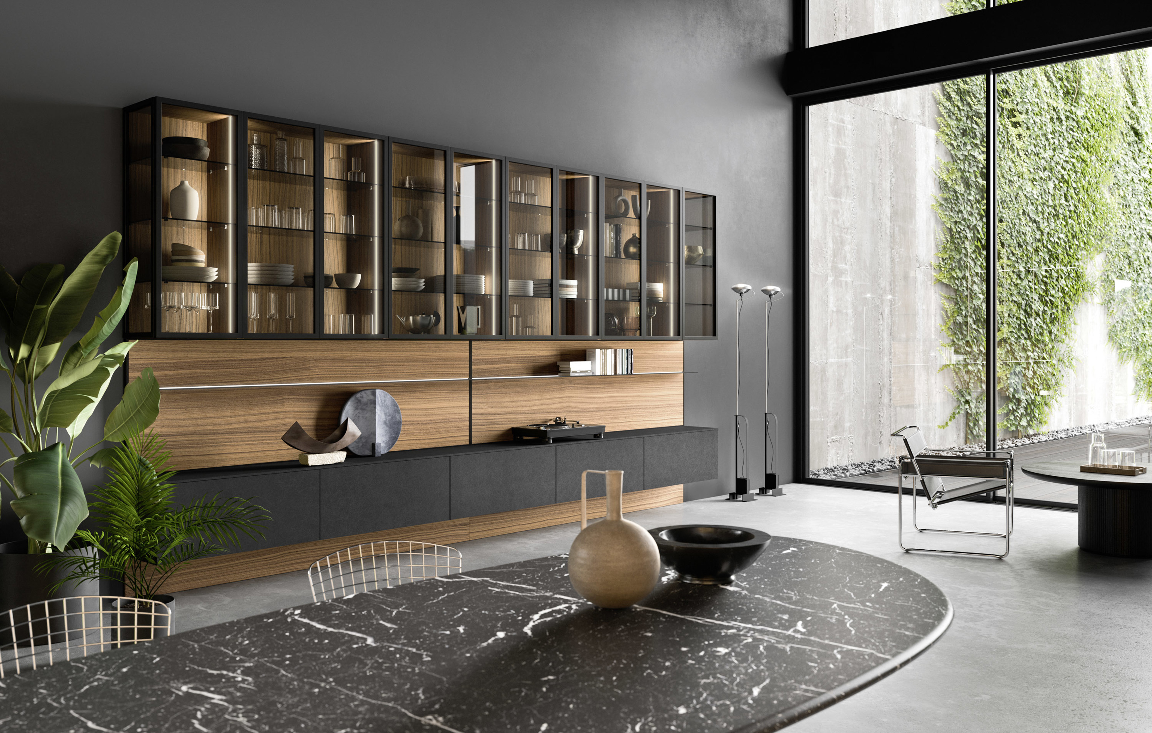 Parete attrezzata del living con vetrine Rialto con ante e ripiani in vetro fumè e fusto in tech materic Noce Italia, boiserie Segno in impiallacciato legno Noce Europeo e mensola in alluminio verniciato nero. Completano la composizione le basi sospese Modula in laccato effetto metallo Piombino, per un insieme elegante e funzionale.