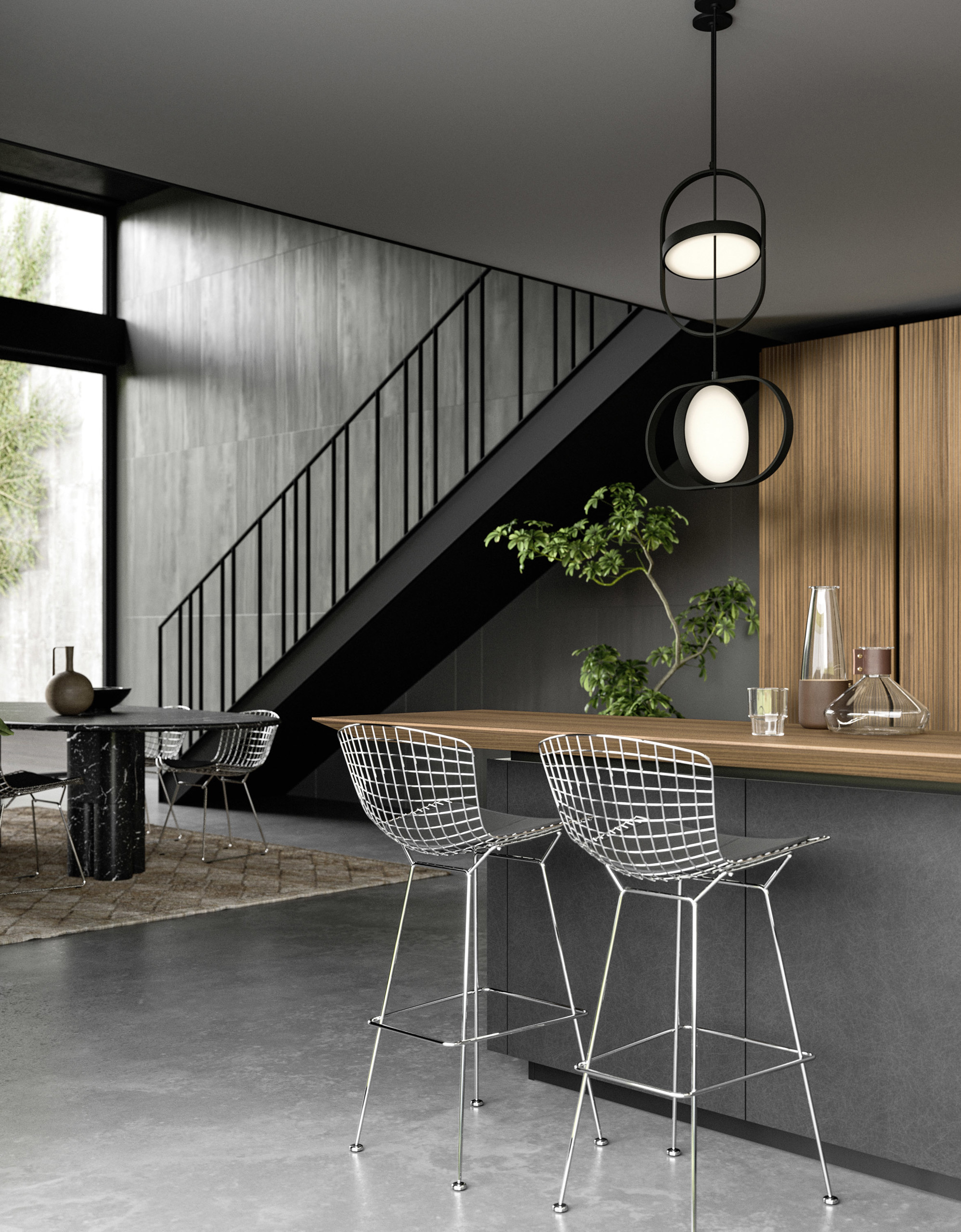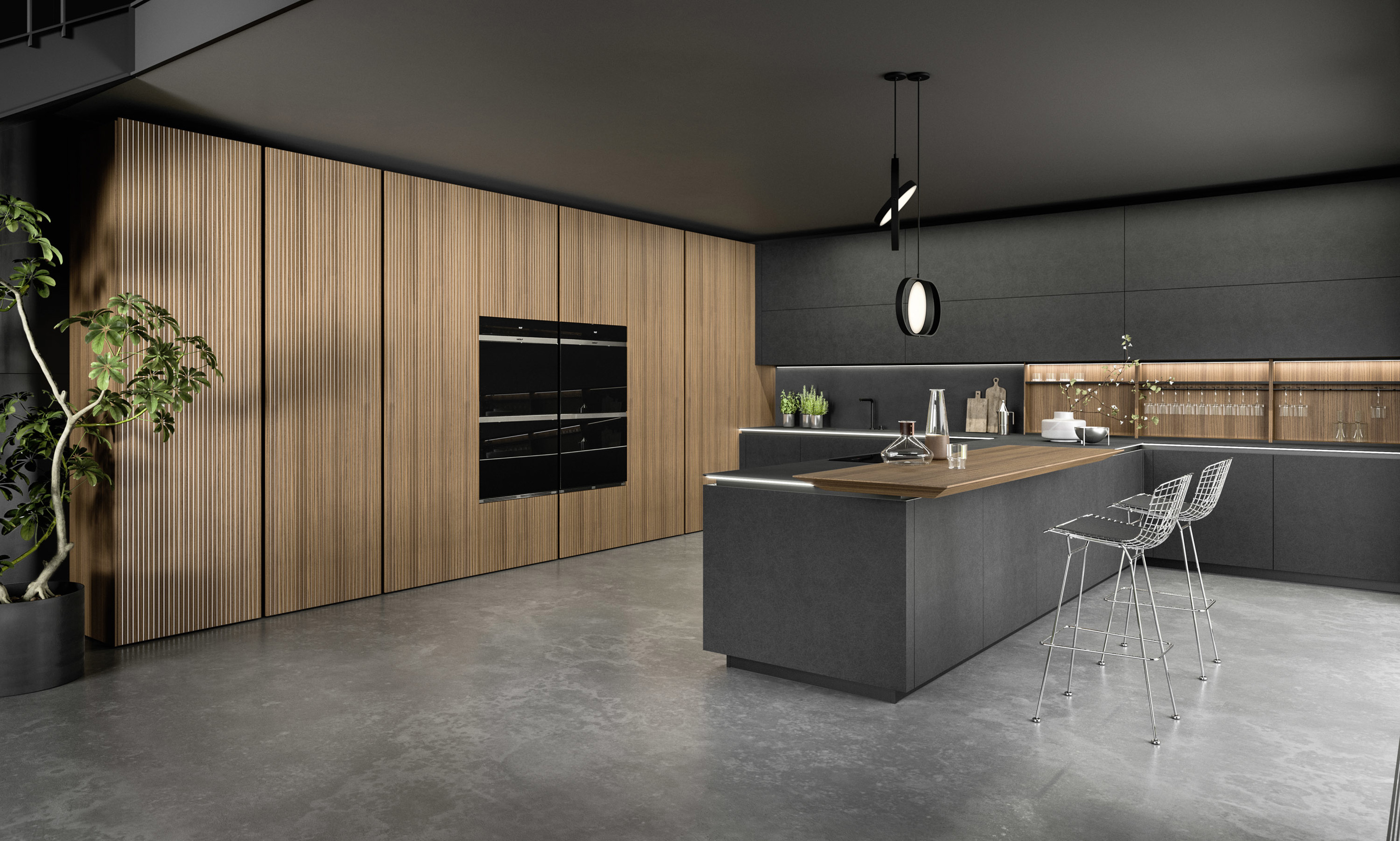 Dinamismo metropolitano. Una cucina imponente, lineare e al contempo funzionale, con basi e penisola in ante Link e colonne con ante Elementi. Perfettamente integrata in un loft dall’estetica ricercata, dove arredi di design e materiali pregiati dialogano con l’ambiente, è progettata per nascondere le parti operative e lasciare in vista solo l’essenziale, esaltando la pulizia formale e l’eleganza materica.