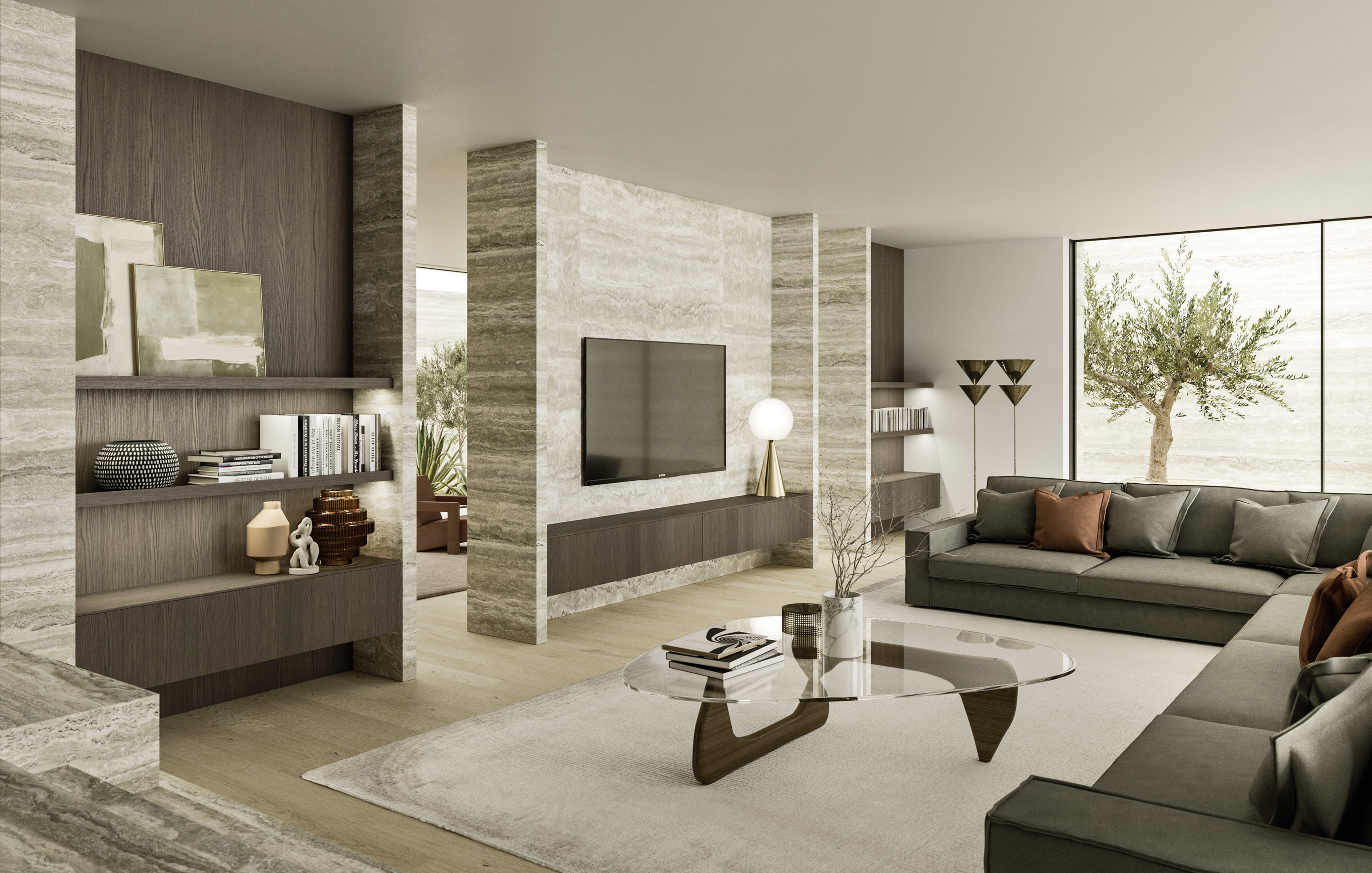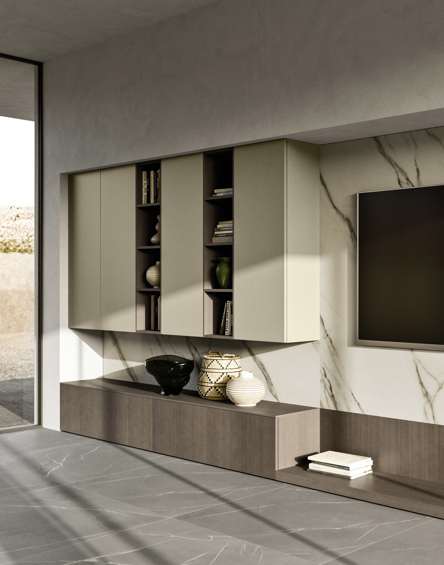 Una composizione living essenziale ed elegante che occupa lo spazio con equilibrio, creando un’atmosfera ordinata e armoniosa senza appesantire l’ambiente. Il carattere del rovere dona continuità materica con cucina e dining.