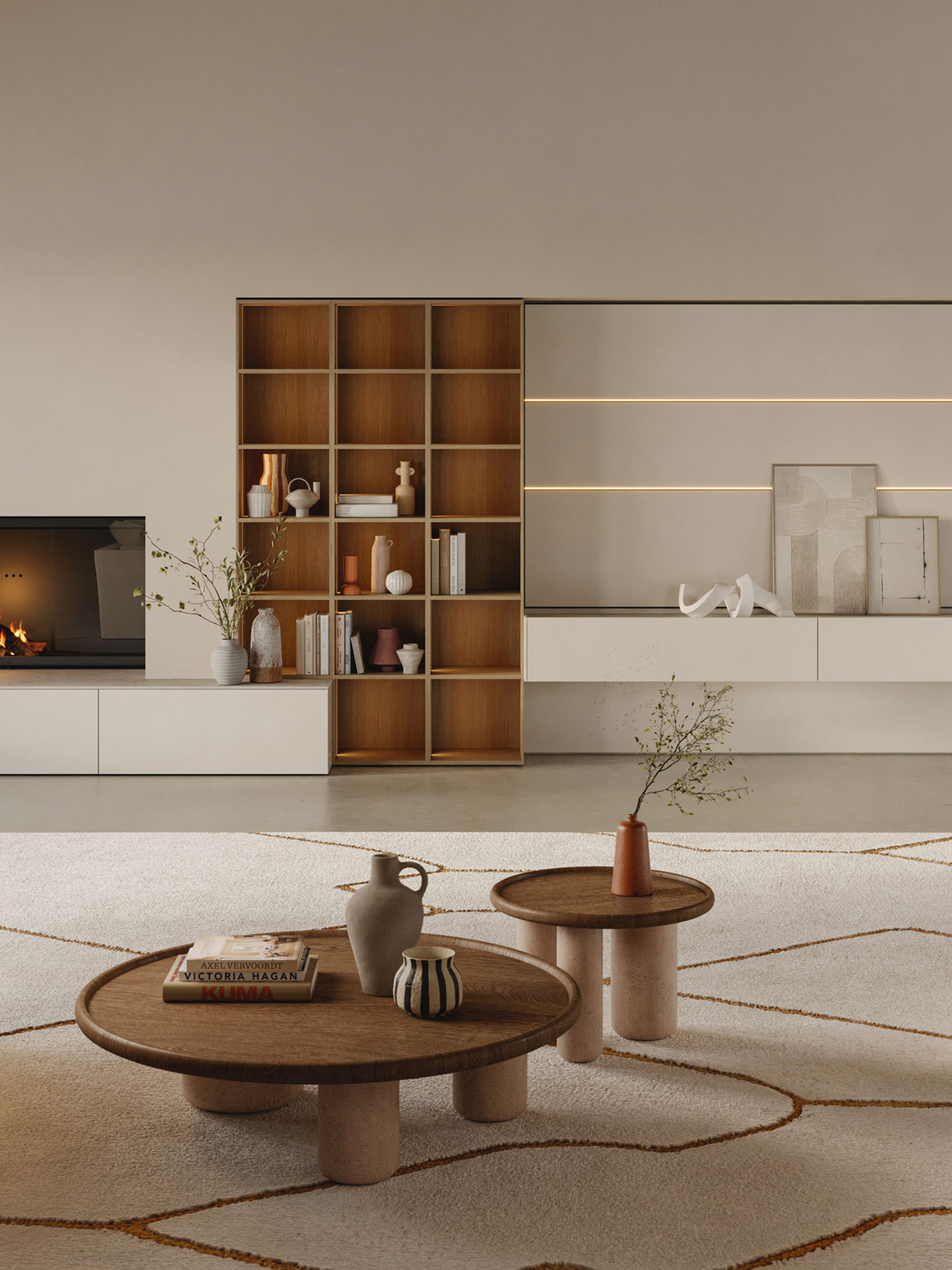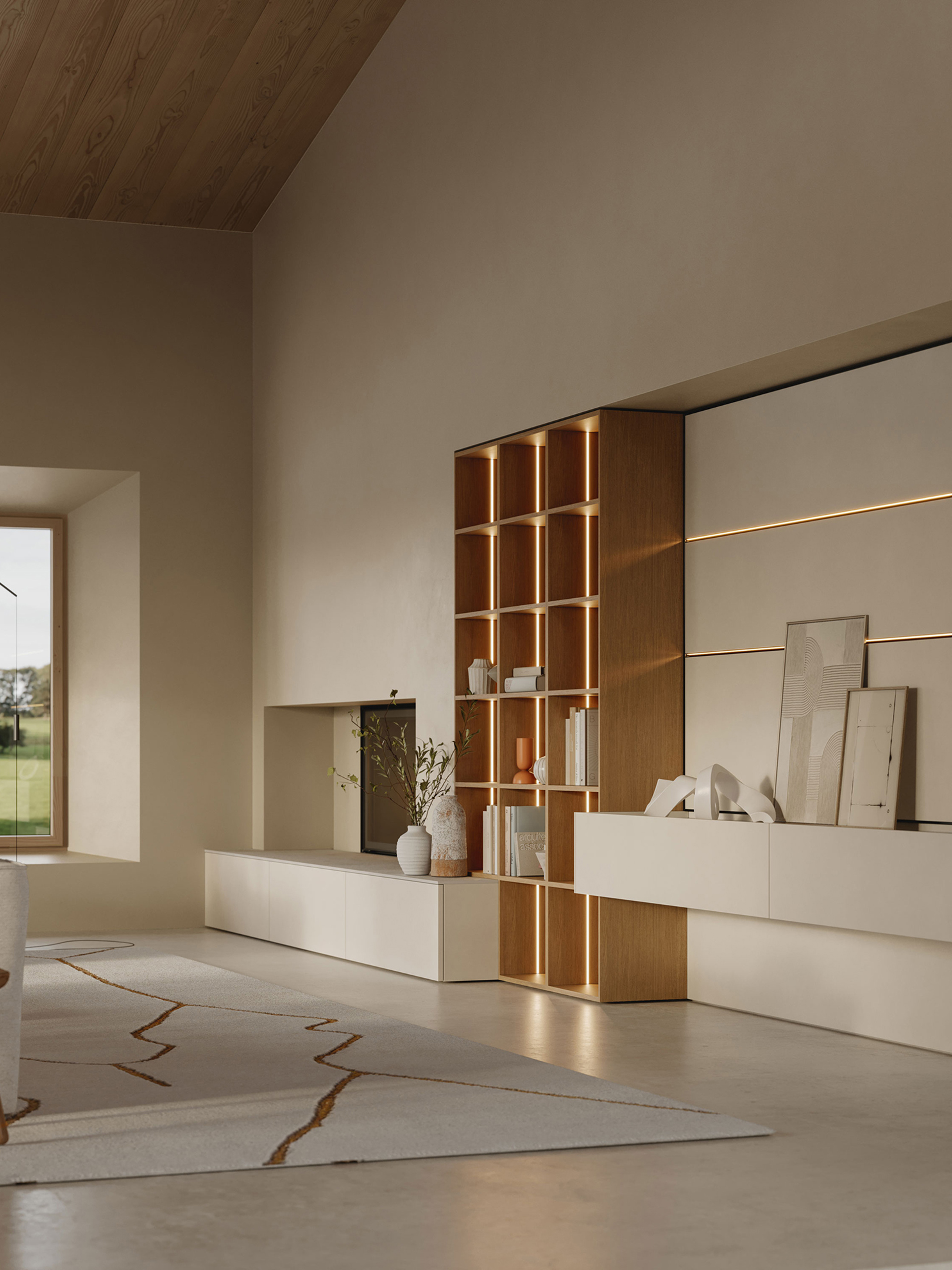 Le vetrine Rialto, in vetro fumé e fusto in tech materic Rovere Caramello, dialogano con la boiserie Segno in tech natural Magnolia.