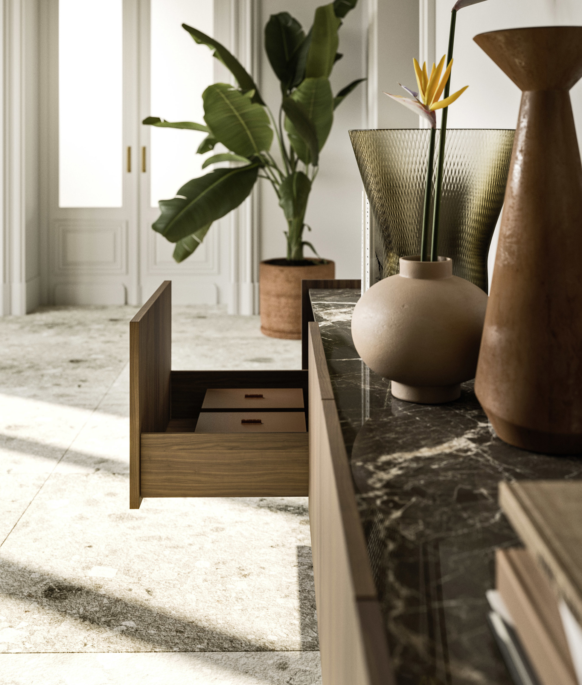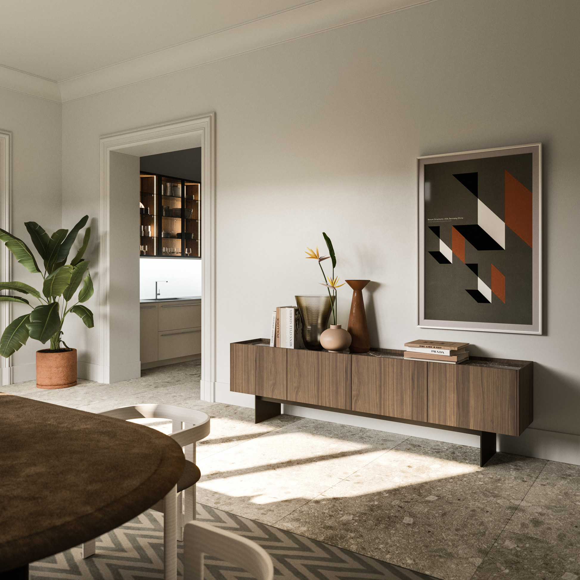 Vetrine Rialto con ante e ripiani in vetro fumé, abbinate a fusto in tech materic Noce Italia, per un equilibrio raffinato tra trasparenze e matericità.