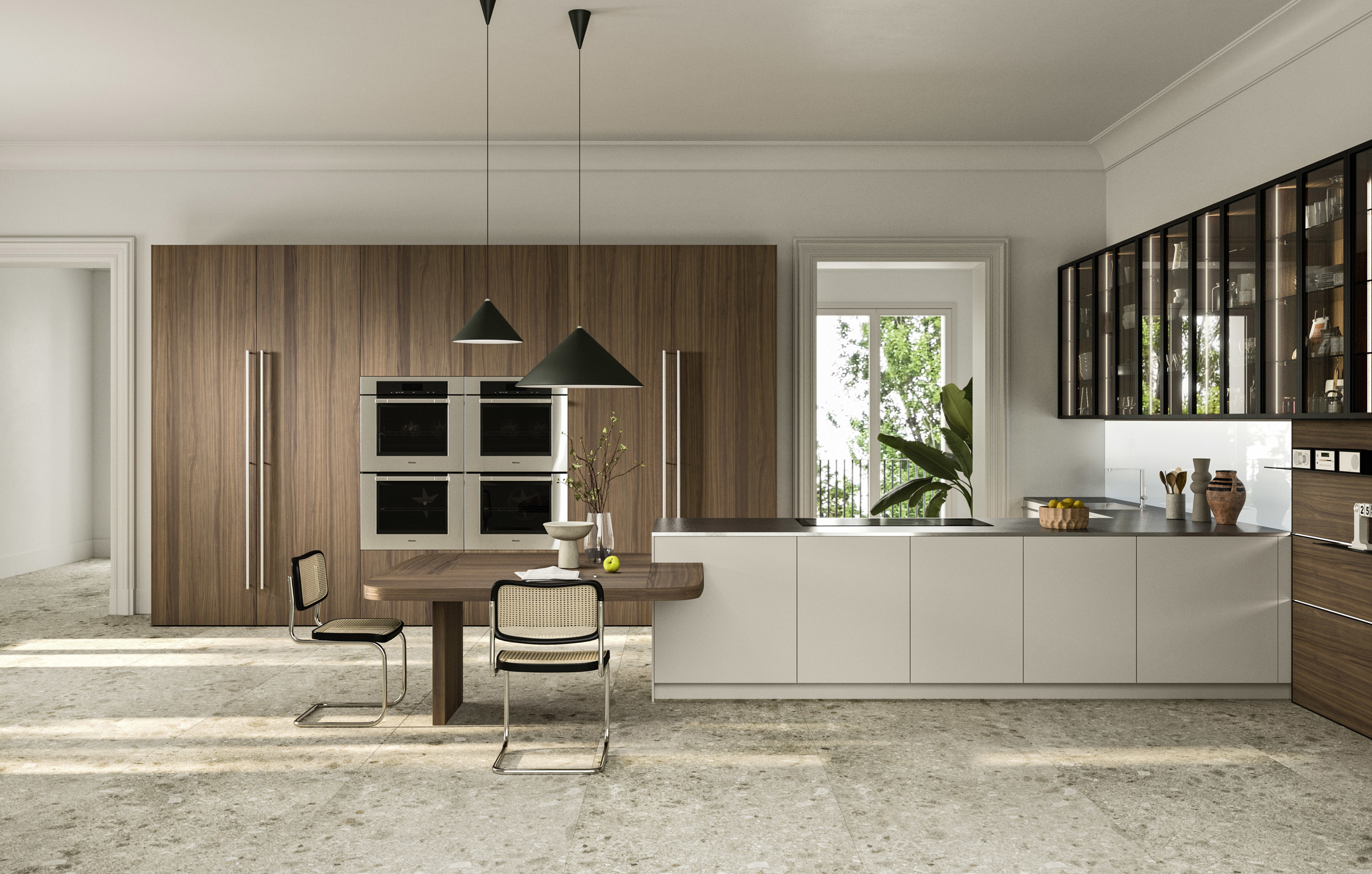 Casa di Ringhiera. La cucina si sviluppa come uno spazio ampio e perfettamente attrezzato, caratterizzato dalle superfici in tech color Grigio Tremiti e in impiallacciato legno Noce Americano. Le vetrine Rialto, leggere e discrete, lasciano intravedere il contenuto e amplificano la luce dell’ambiente. Al centro del progetto, il tavolo Regolo, integrato nella penisola operativa, diventa il fulcro dei pasti quotidiani, mentre la sala da pranzo adiacente accoglie i momenti di convivialità in un’atmosfera elegante e misurata.