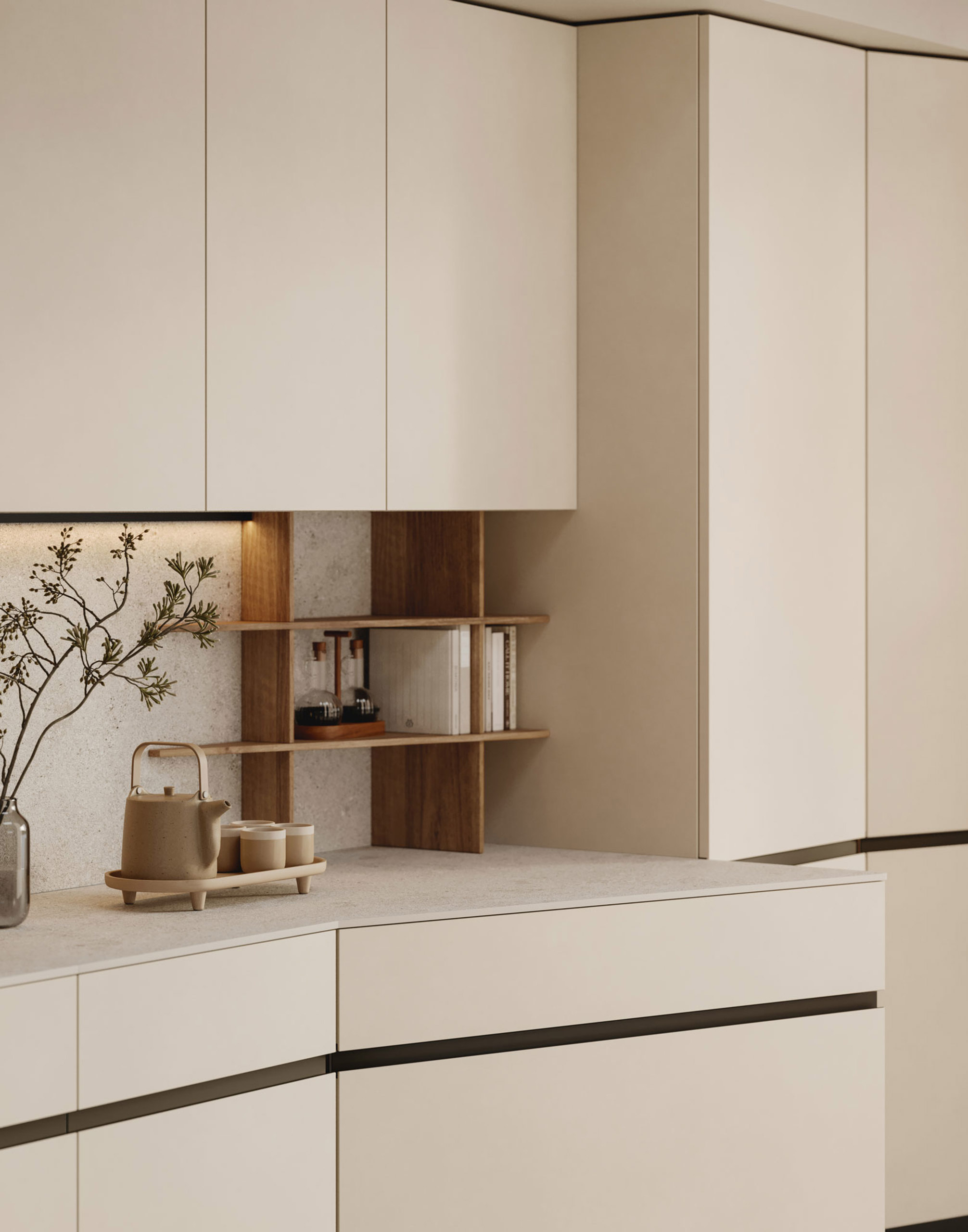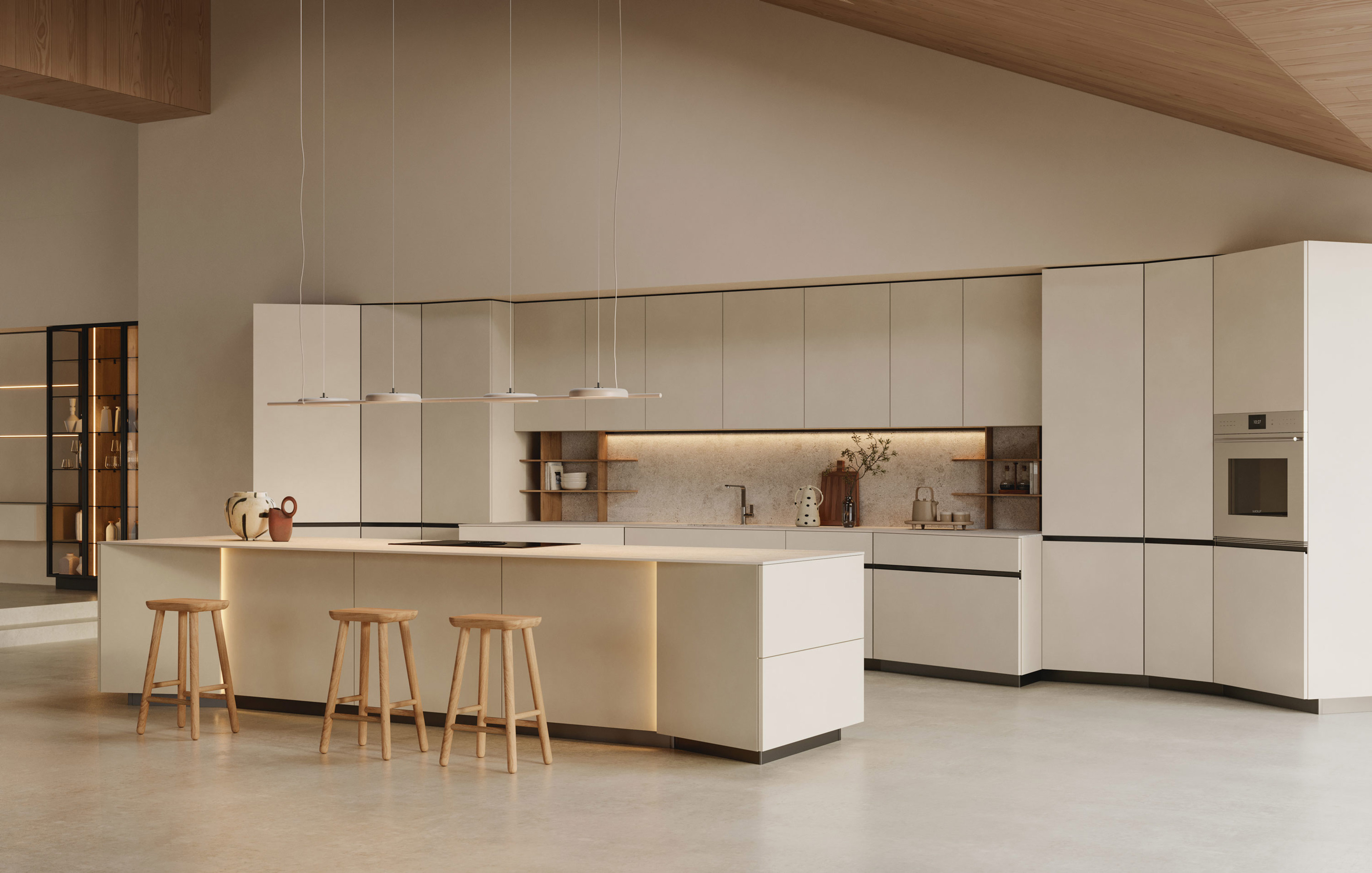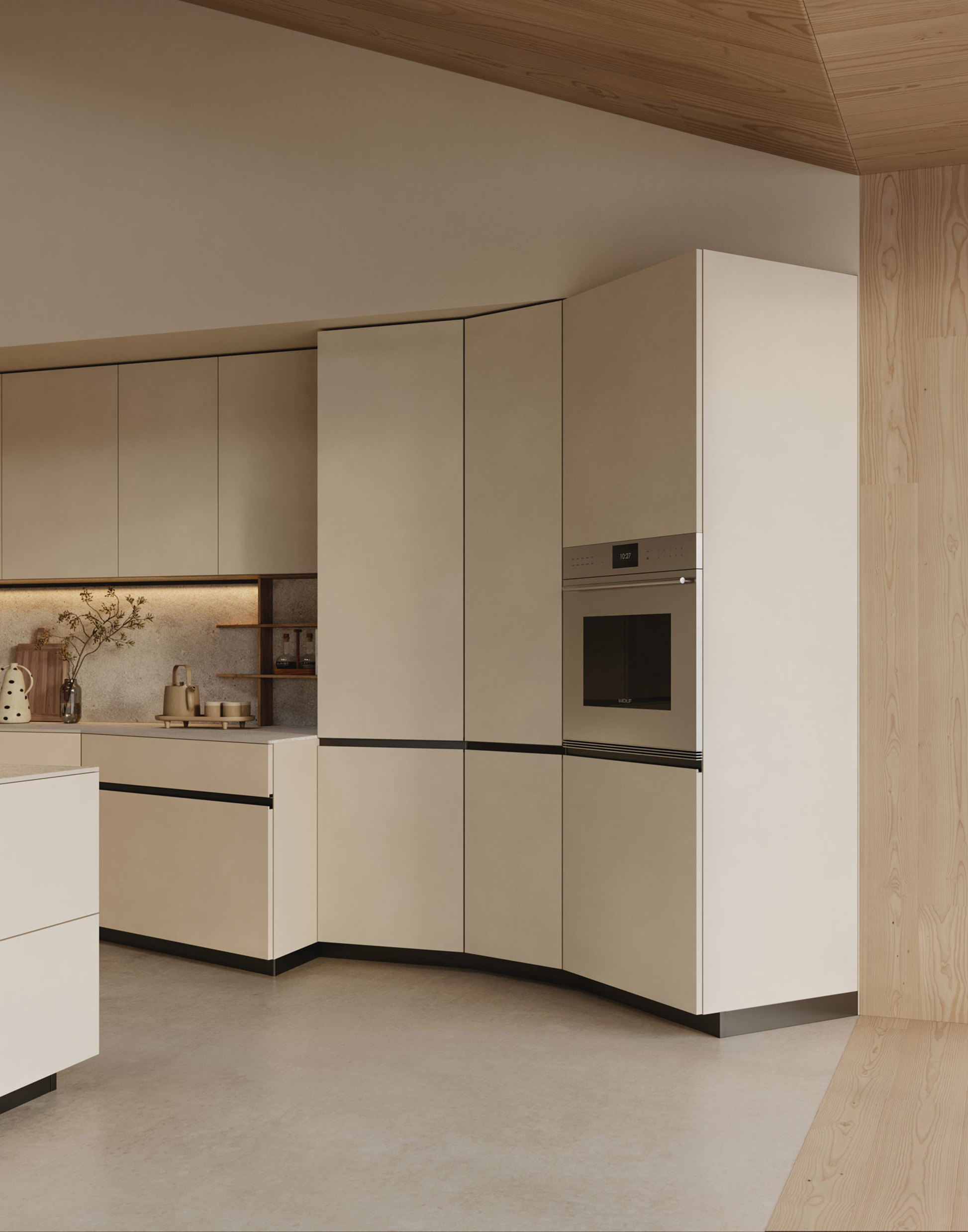 Modulo Orbita con rotazione di 20° su basi, colonne e isola in tech natural Magnolia, abbinato a piano lavoro e schienale in ceramica Pietra Avorio.