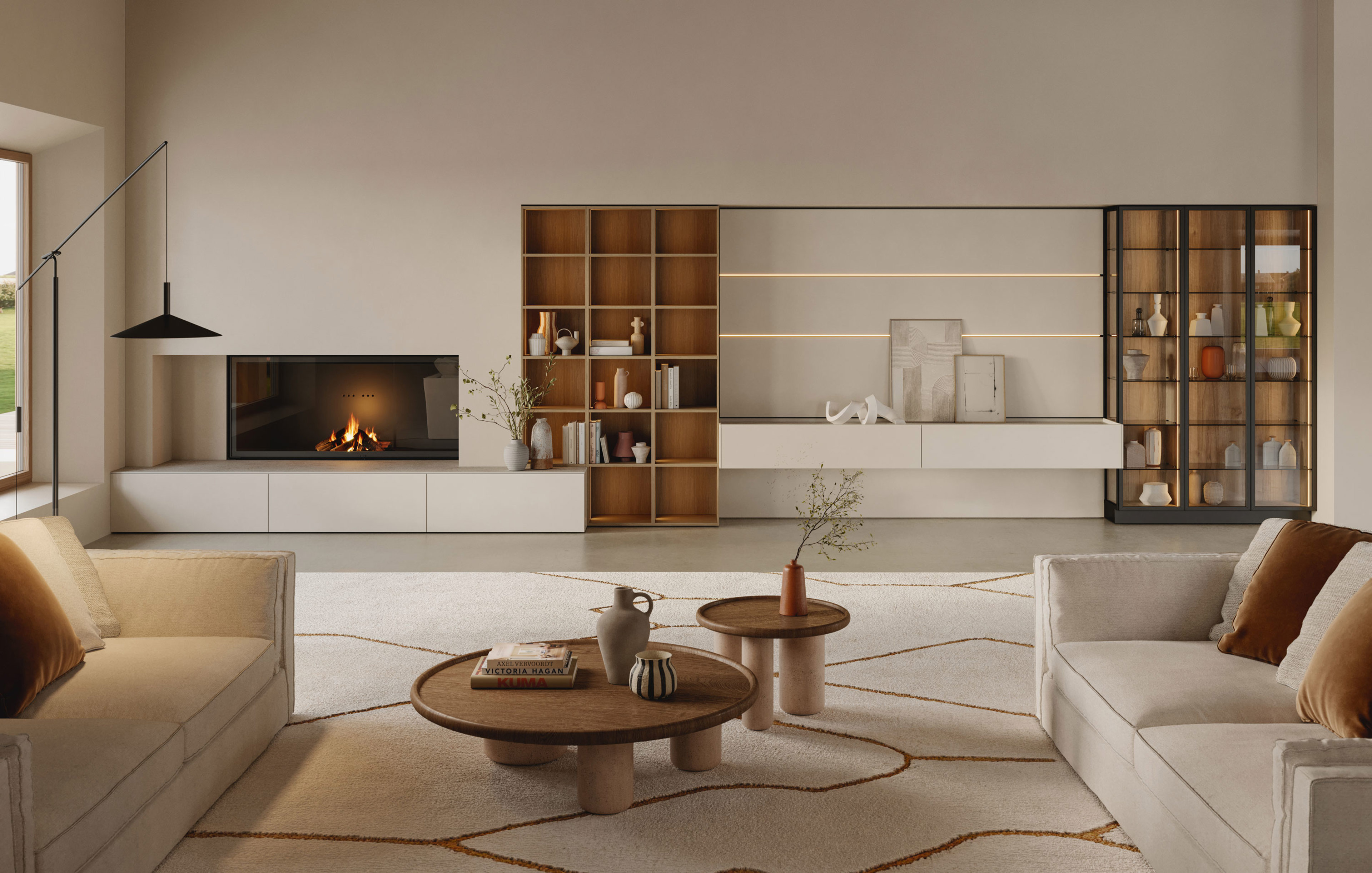 Living con basi Modula a terra e sospese in tech natural Magnolia, top in ceramica Pietra Avorio e boiserie Segno coordinata, arricchito da elementi a giorno Vista in Rovere Spacco e vetrine Rialto che completano l’ambiente con leggerezza ed eleganza.