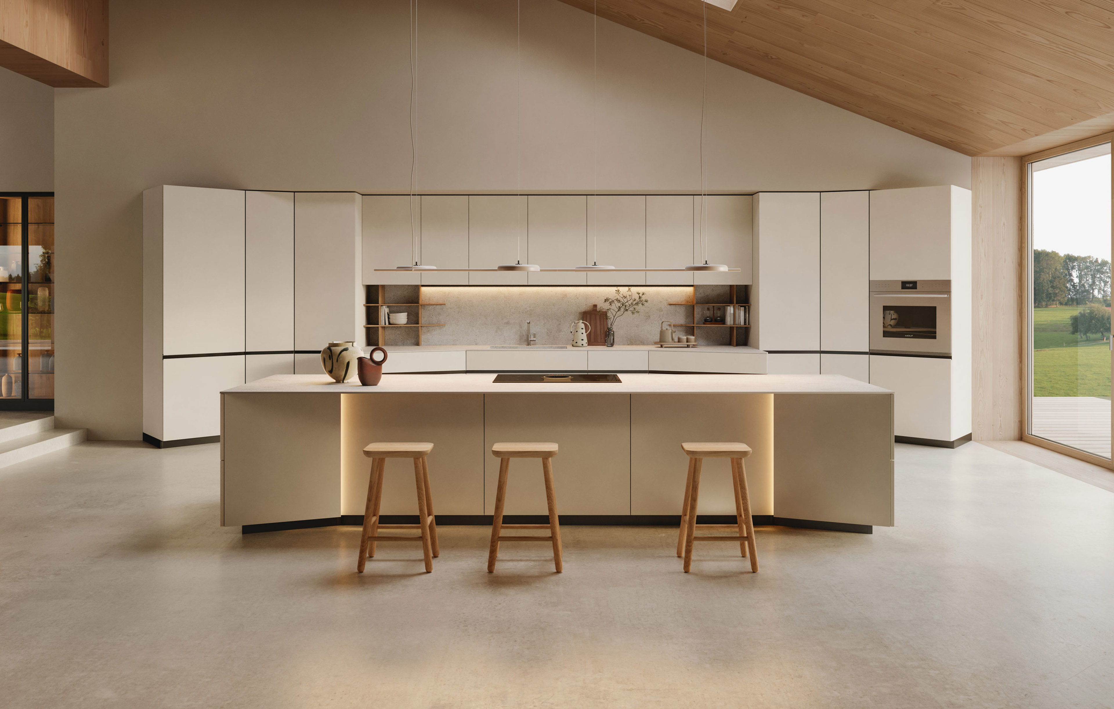 L'incanto del nord. In cucina, lo spazio è concepito come un sistema organico che si apre verso living e dining, creando un ambiente fluido e interconnesso. Il dinamismo è dato dagli elementi Orbita che, con la loro inclinazione, rendono la composizione più avvolgente e i gesti più naturali. Il dialogo materico tra tech natural in cucina e living e l’impiallacciato legno nel dining completa un equilibrio armonico tra estetica e funzionalità.
