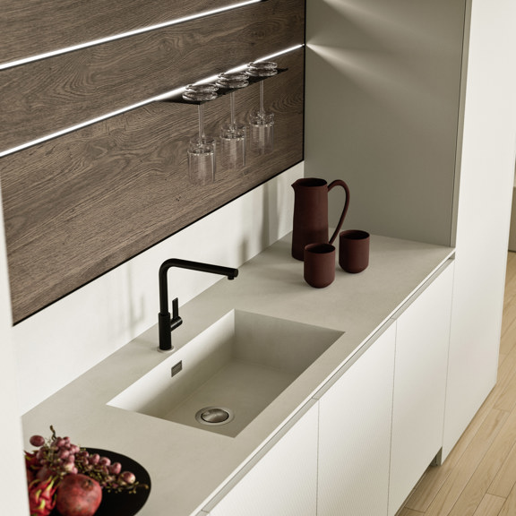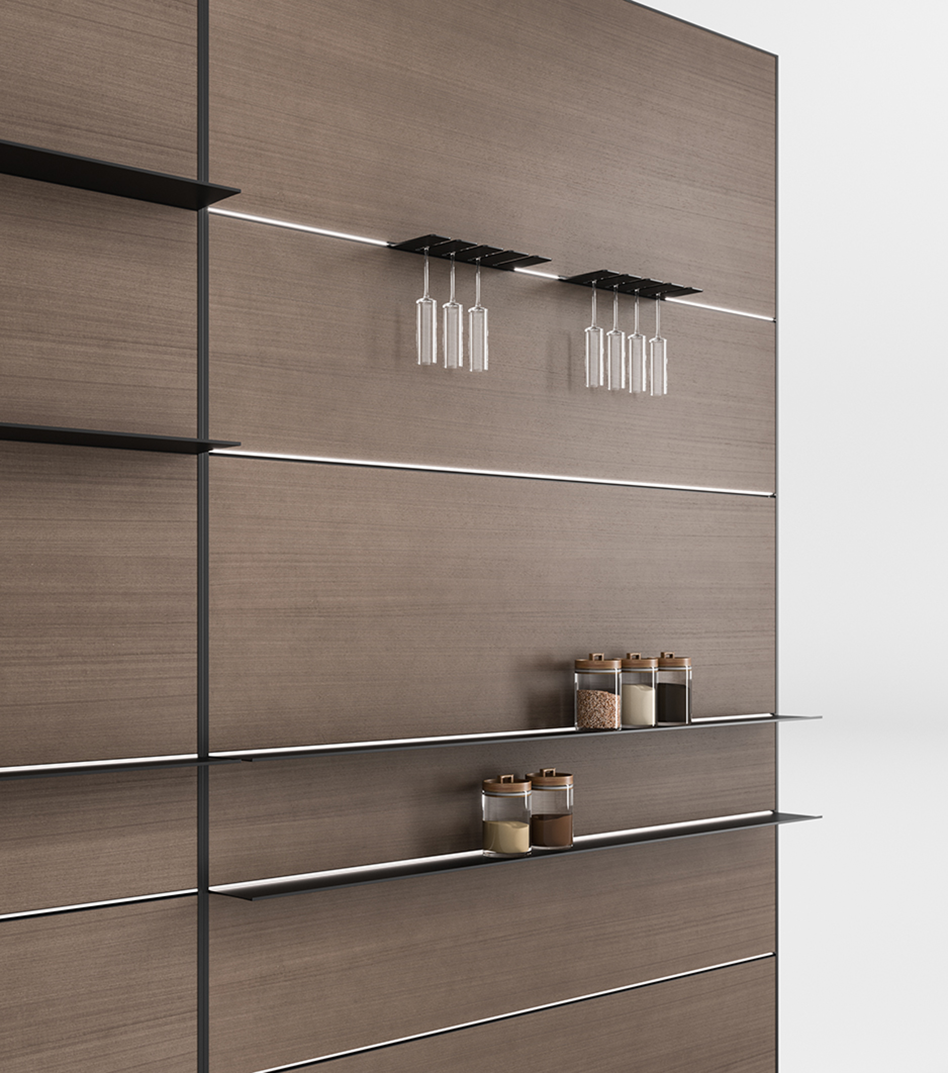 Segno è una boiserie cucina da attrezzare con mensole, porta calici, elementi a giorno e ganci. In corrispondenza dei tagli orizzontali che accolgono questi elementi, possono essere montati dei profili luminosi. Funzionale anche come parete attrezzata per il living, Segno si integra a tutti gli elementi Snaidero, dando un tocco di personalità a ogni ambiente.