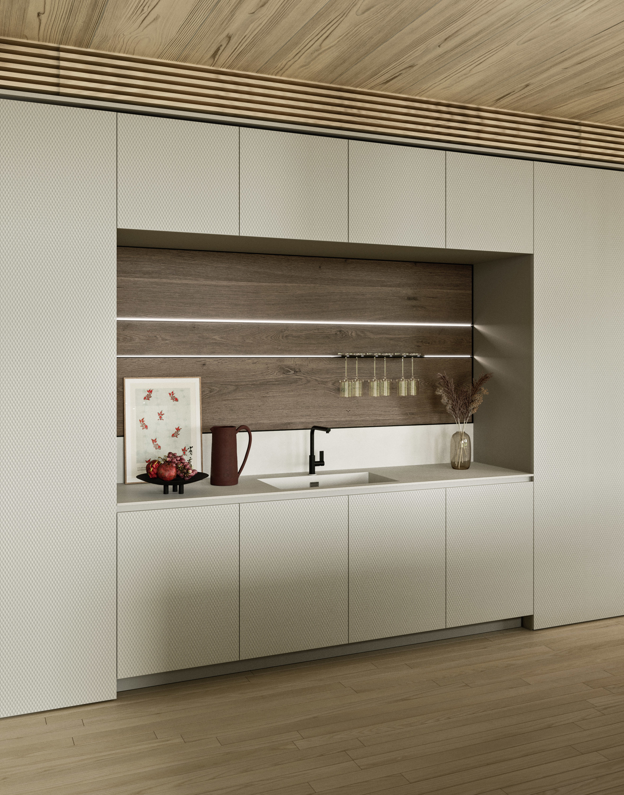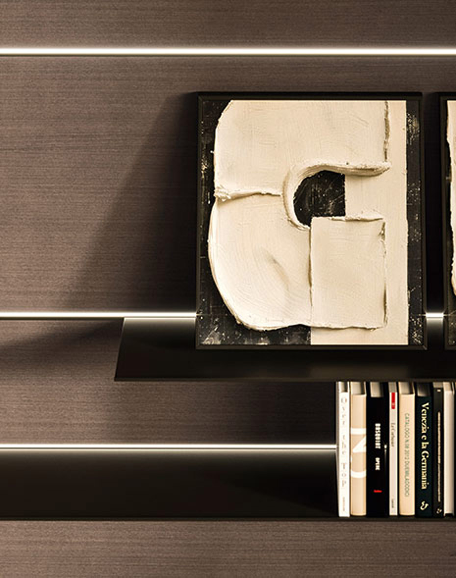 La boiserie Segno è realizzabile nelle finiture Tech, Laccati, Fenix e Impiallacciati Legno, offrendo un’ampia libertà compositiva e la possibilità di adattarsi a diversi linguaggi progettuali, dal più tecnico al più materico.
