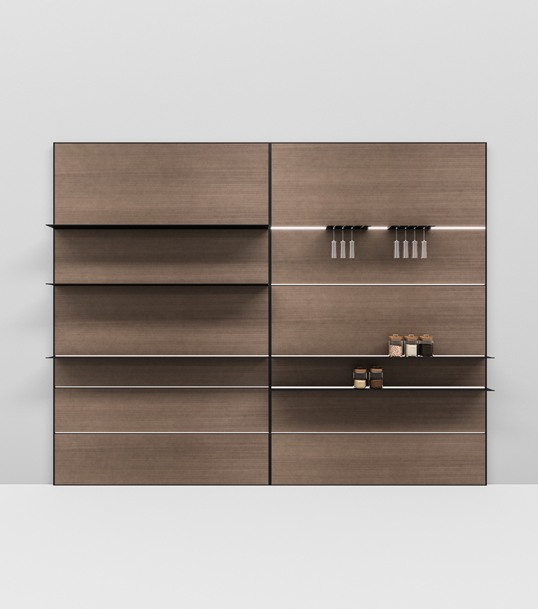 Questa parete attrezzata è completabile con accessori quali ganci, mensole, porta calici ed elementi a giorno, per un utilizzo funzionale in cucina e nel living.