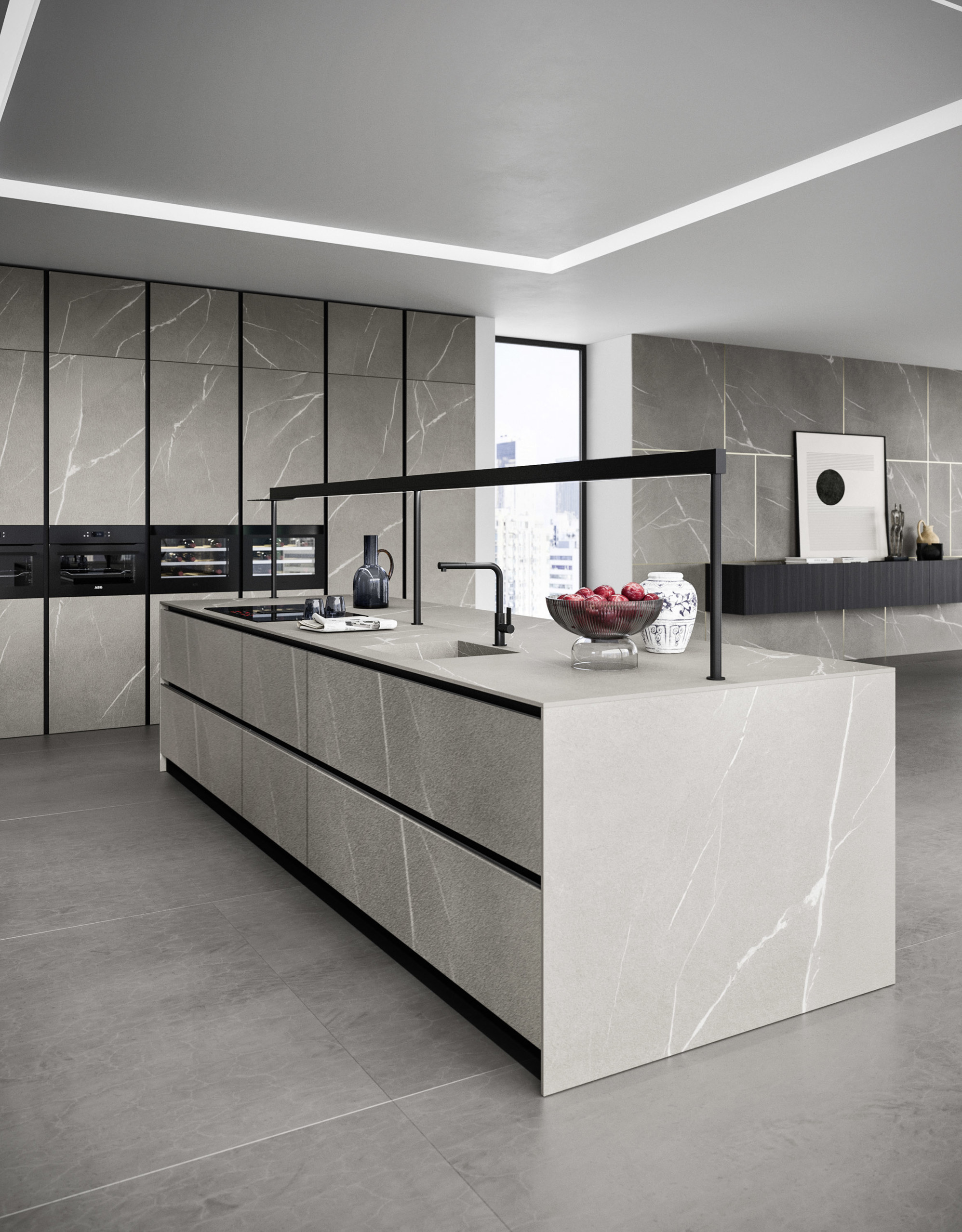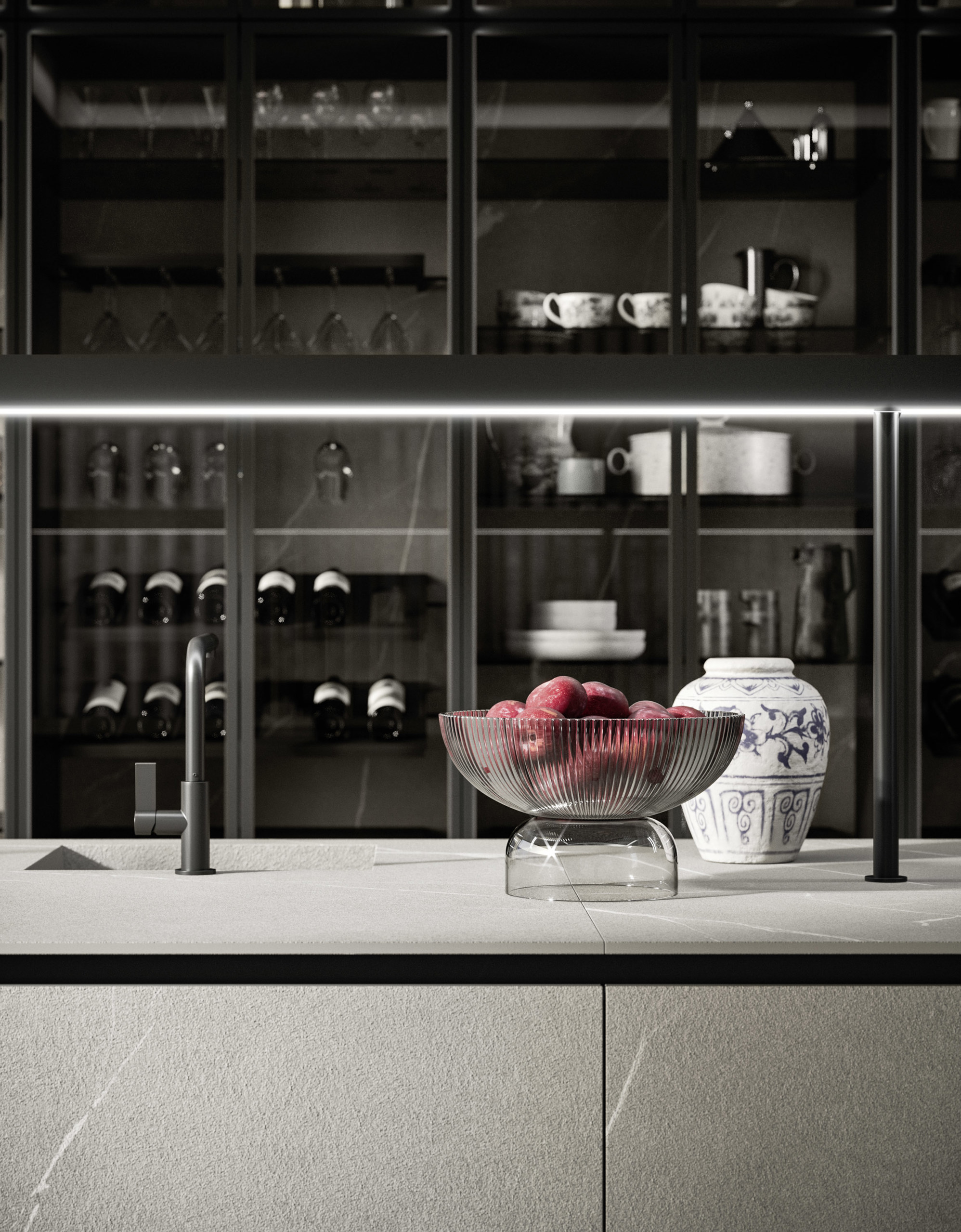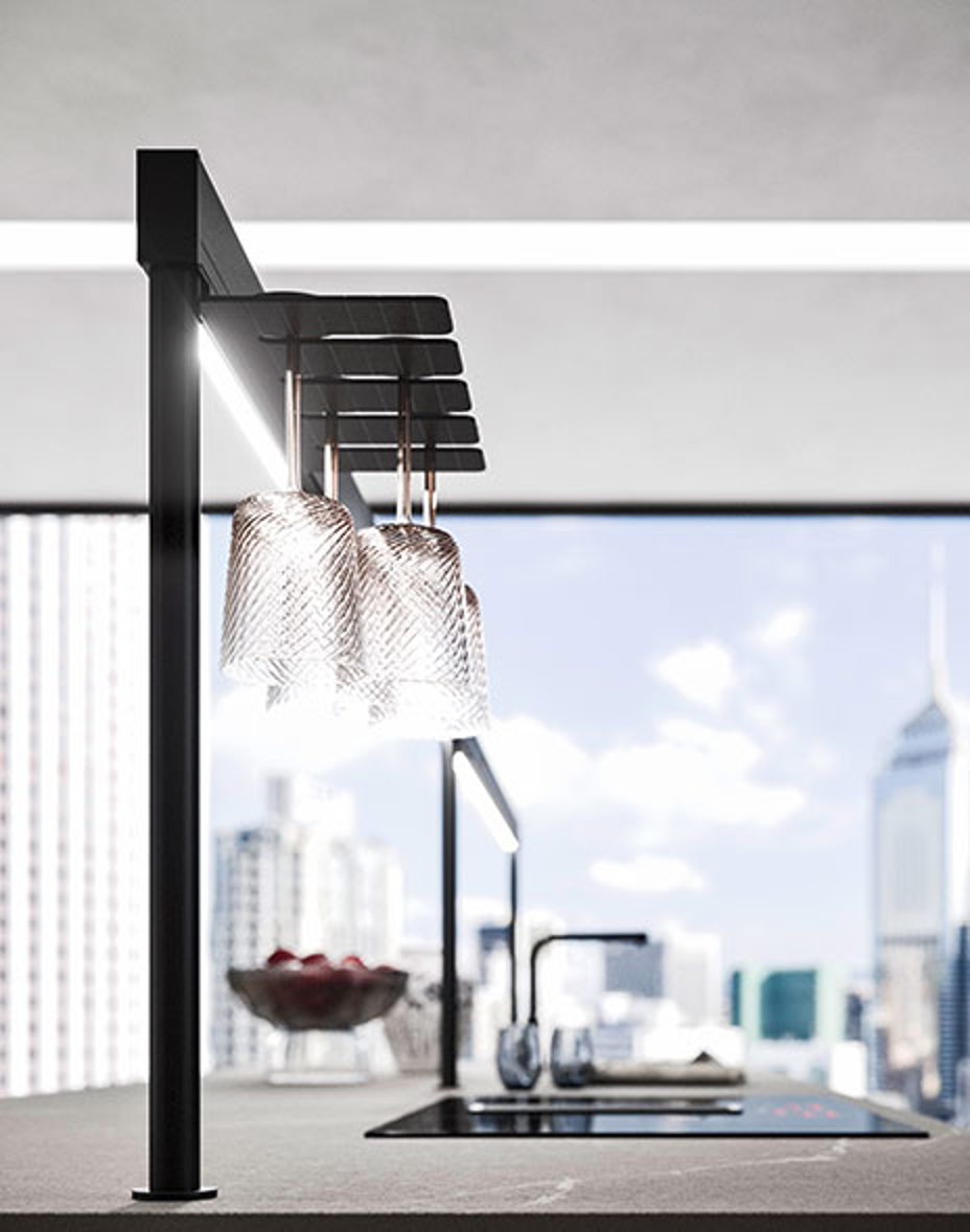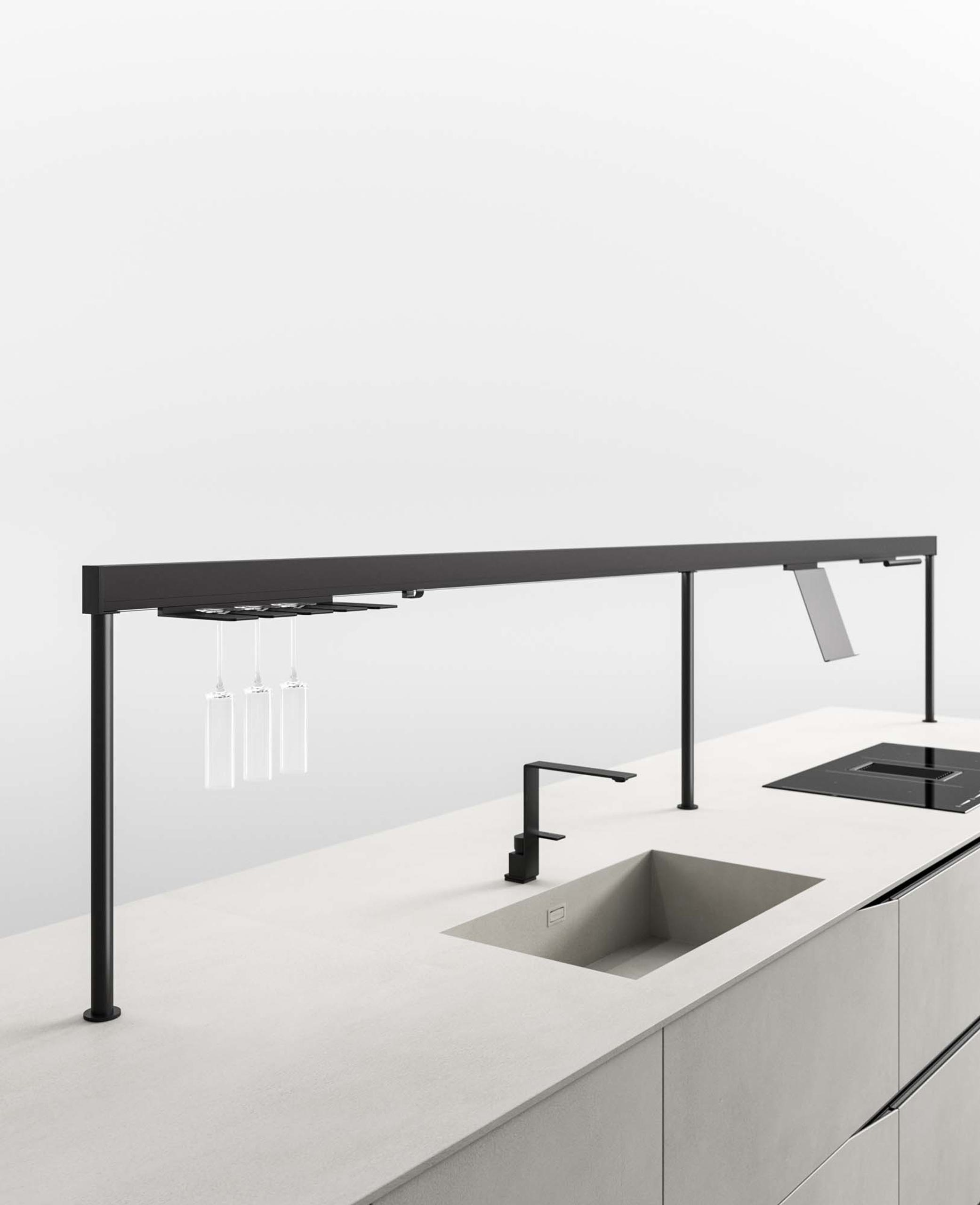 Una consolle a ponte tecnologica e leggera, in finitura alluminio anodizzato nero, sospesa sul piano di lavoro dell’isola o della penisola. Elemento discreto, trasversale a tutta la gamma, Tibetus è dotata di profilo luminoso e accessori removibili come ganci, porta calici, porta iPad e portarotolo.