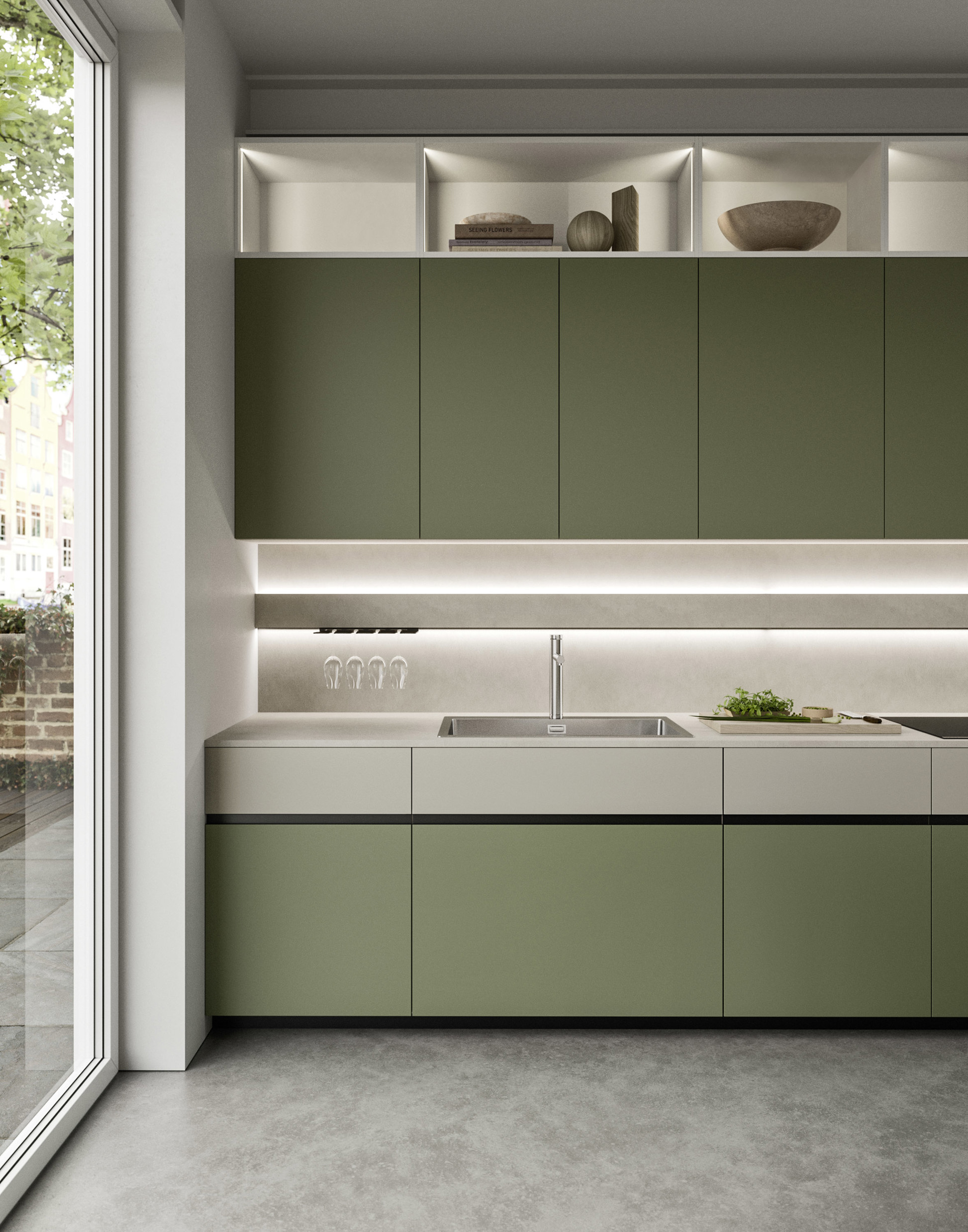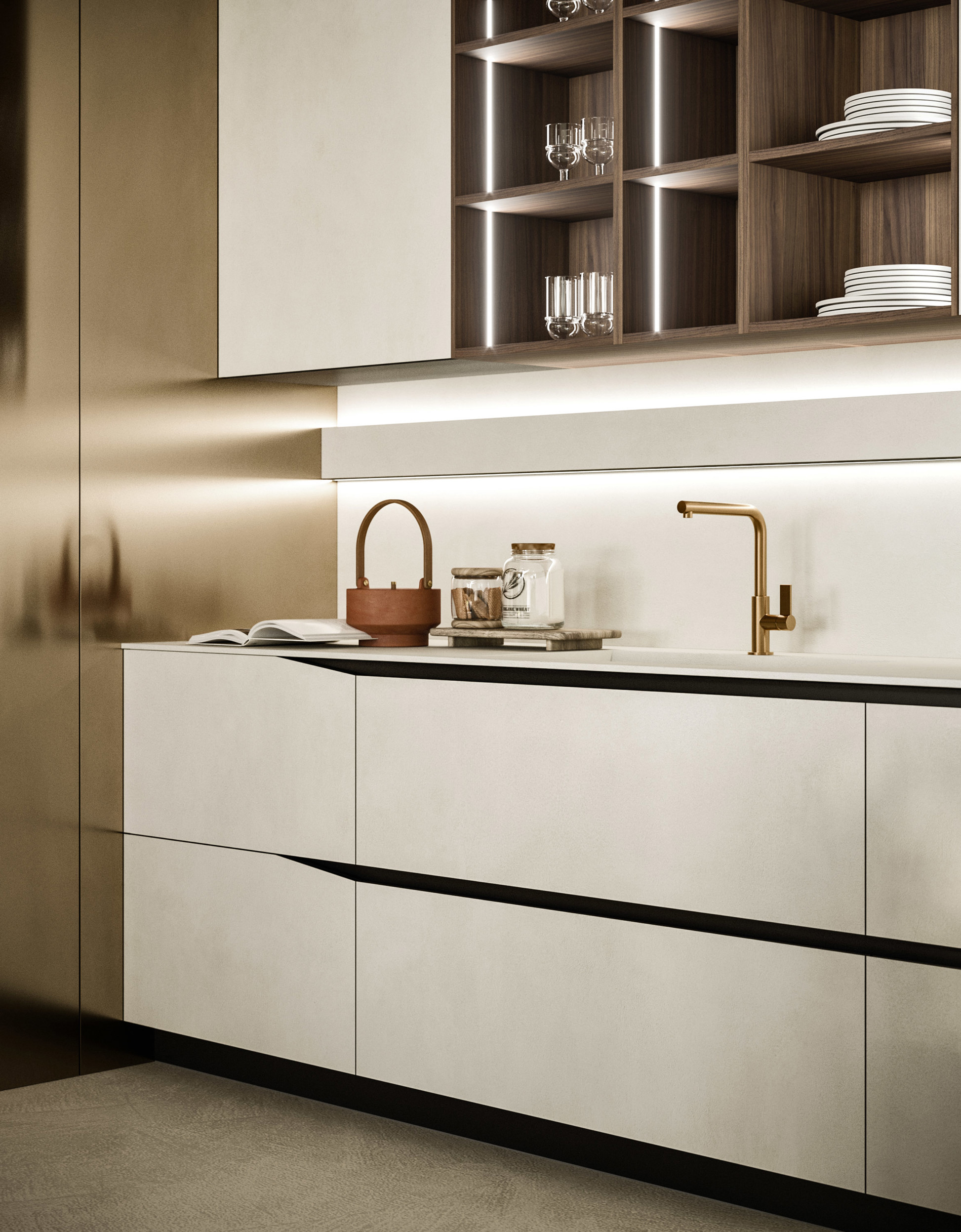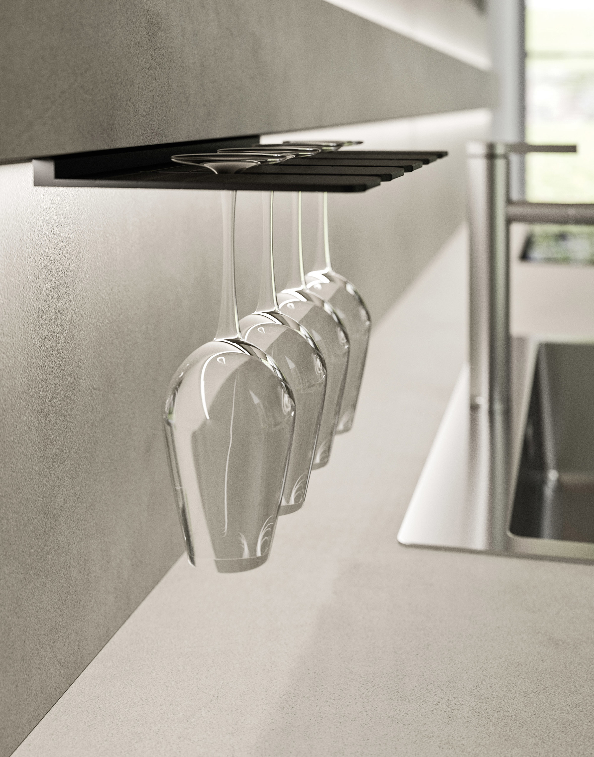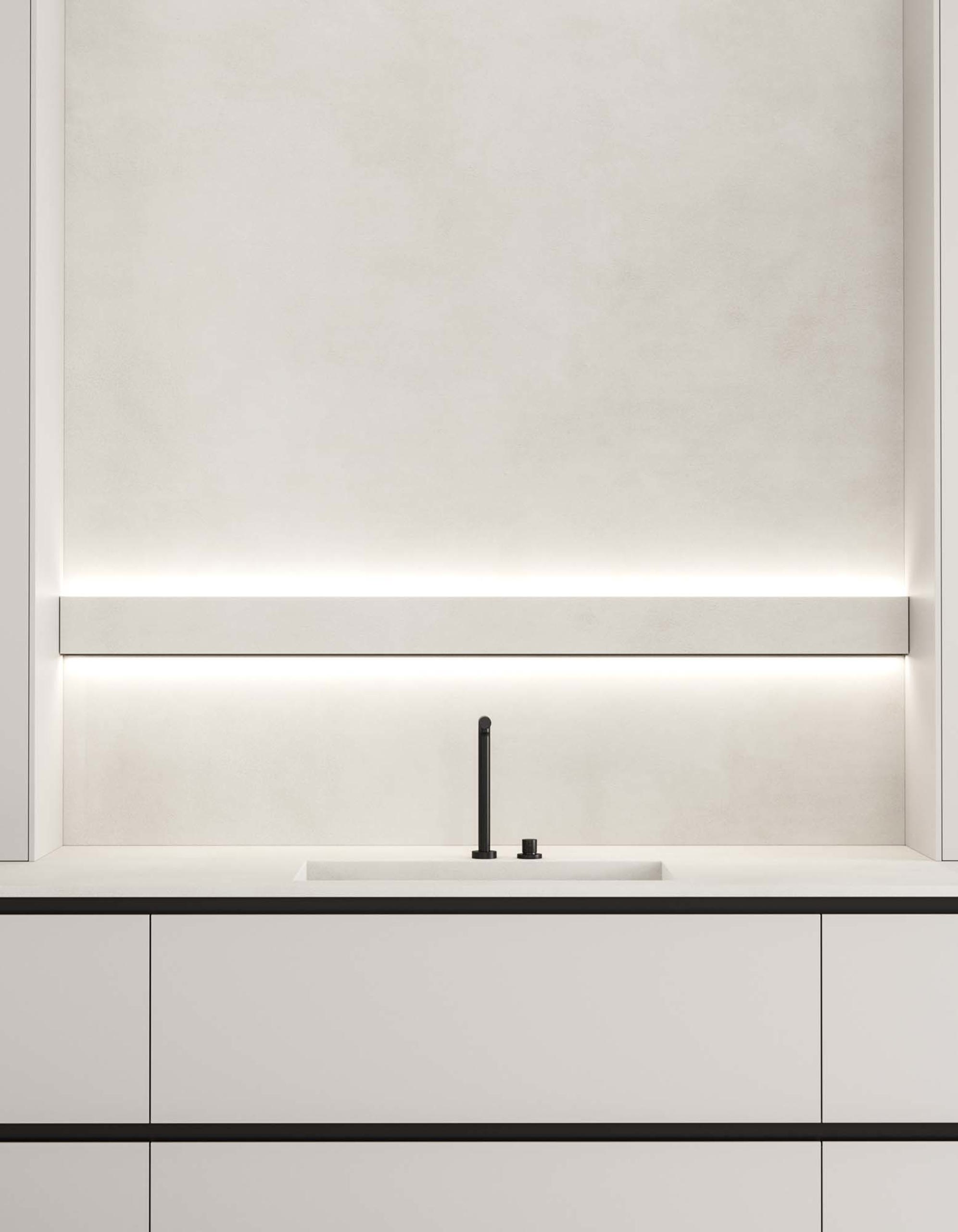 Una fascia luminosa per la zona operativa della cucina. Le sorgenti luminose, inferiore e superiore, illuminano il piano di lavoro e allo stesso tempo emanano un’elegante luce soffusa, ideale per gli spazi cucina che dialogano con altri ambienti della casa. La fascia luminosa Velo si può attrezzare con accessori come il porta iPad, il portarotolo e il porta calici.