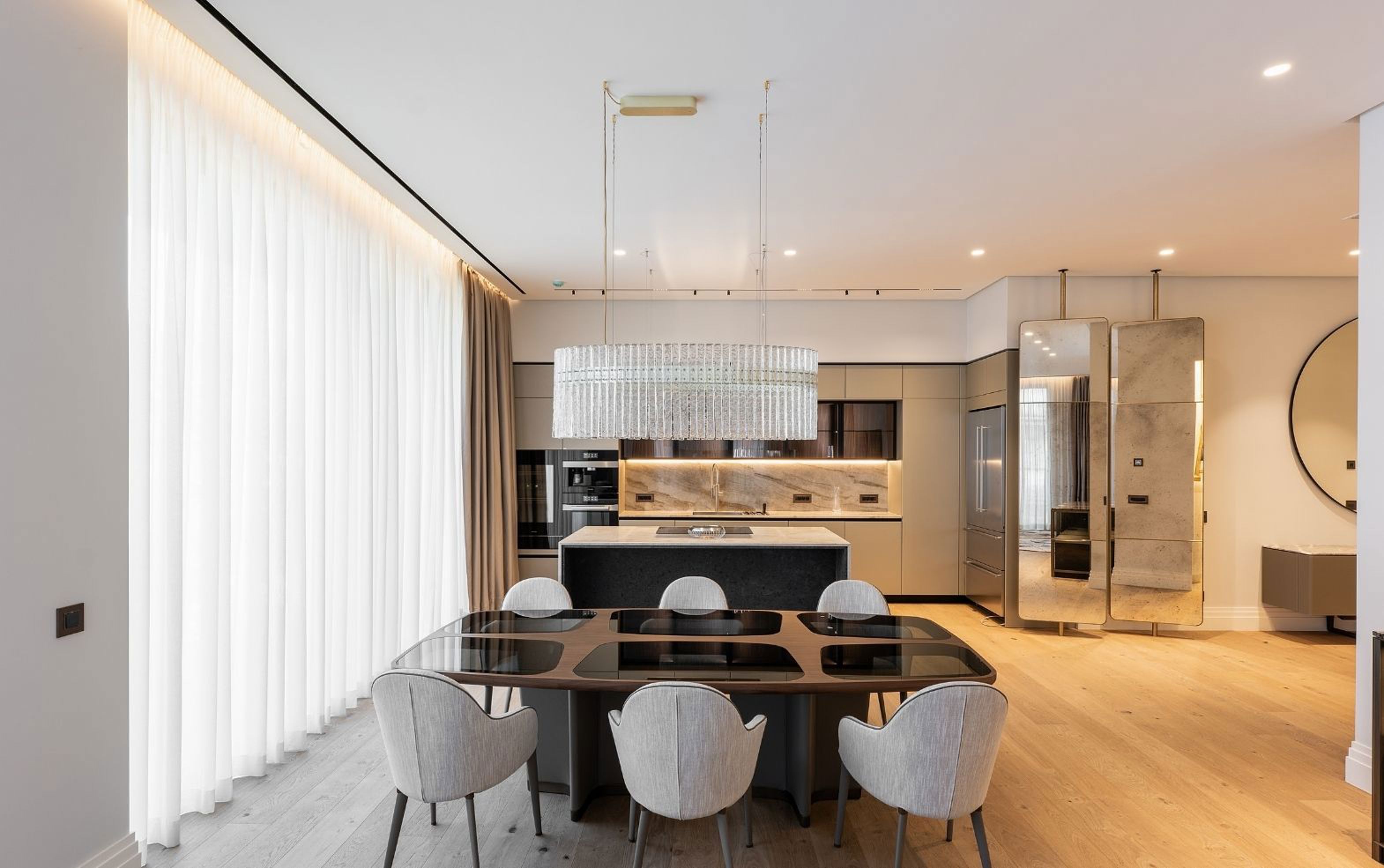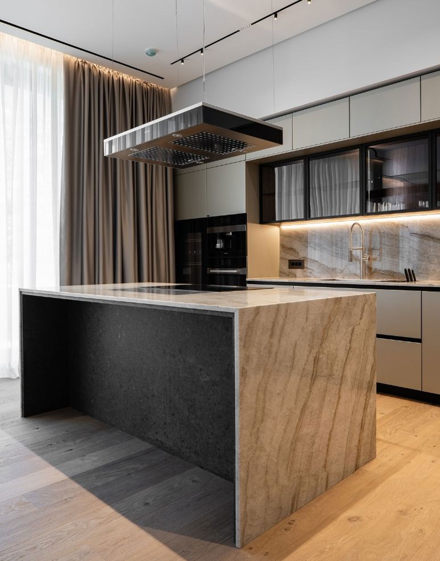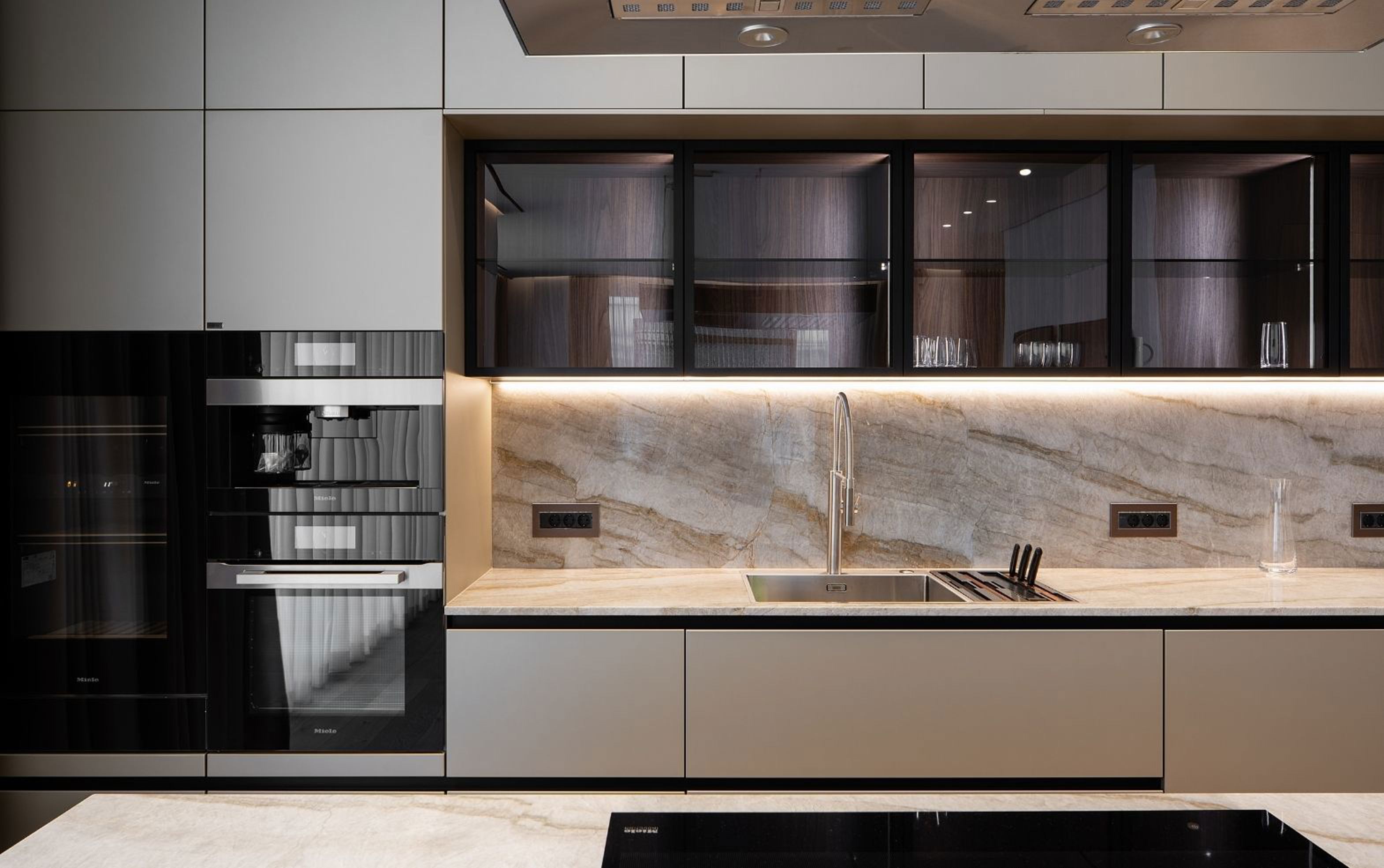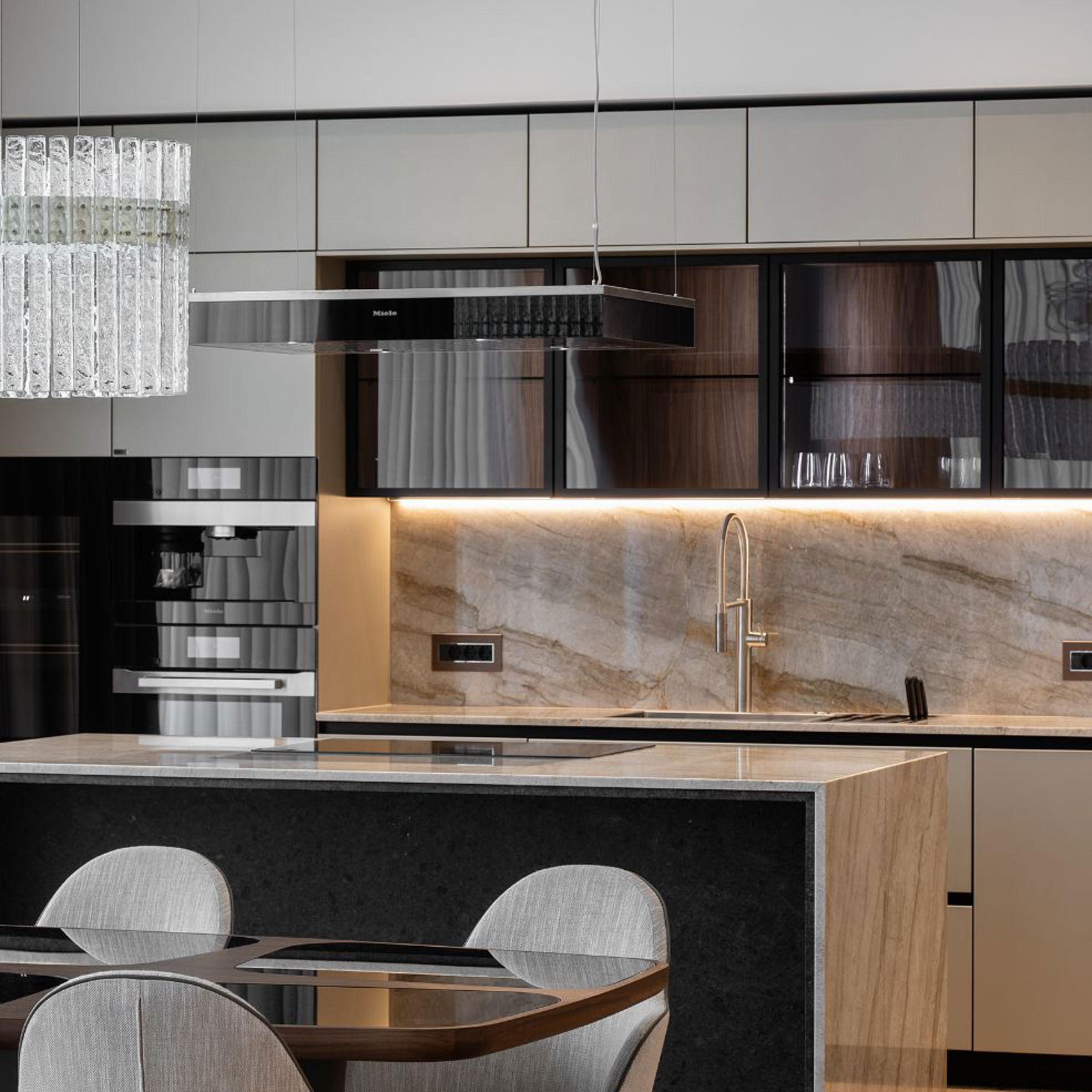 Eleganza sofisticata al Parco Kalemegdan di Belgrado. Questo progetto fonde la luminosità profonda del laccato micalizzato Champagne con la bellezza senza tempo della quarzite lucida Taj Mahal.