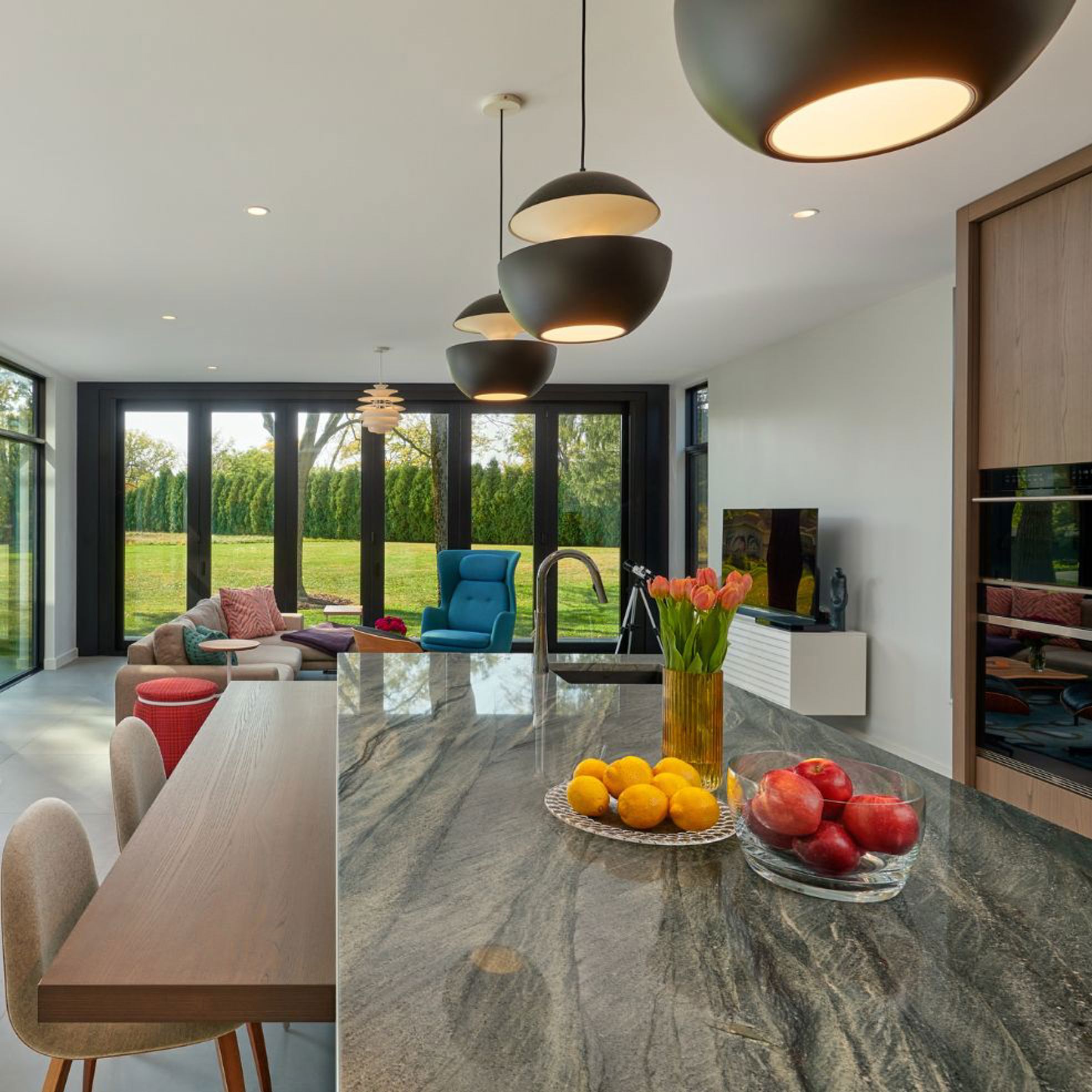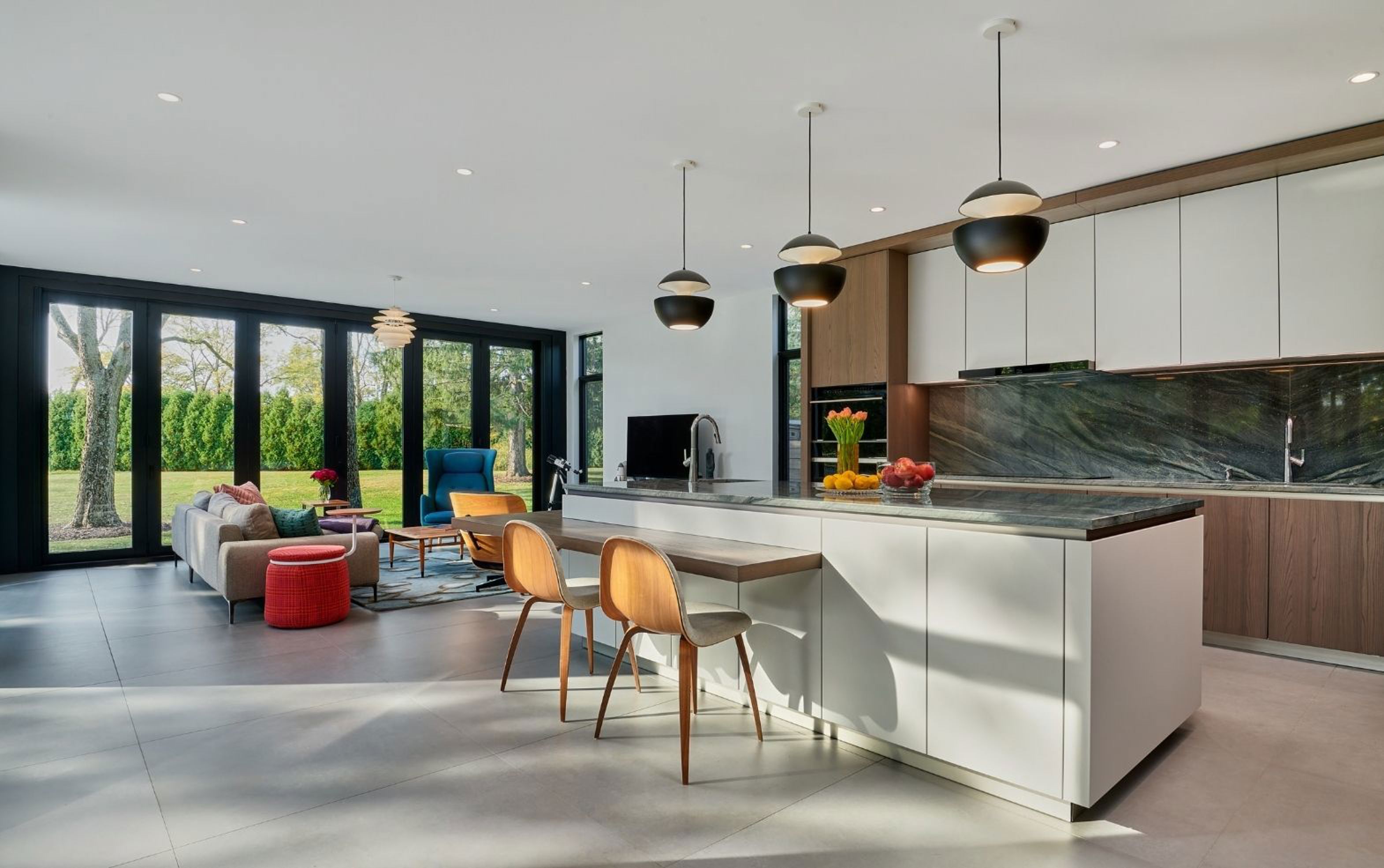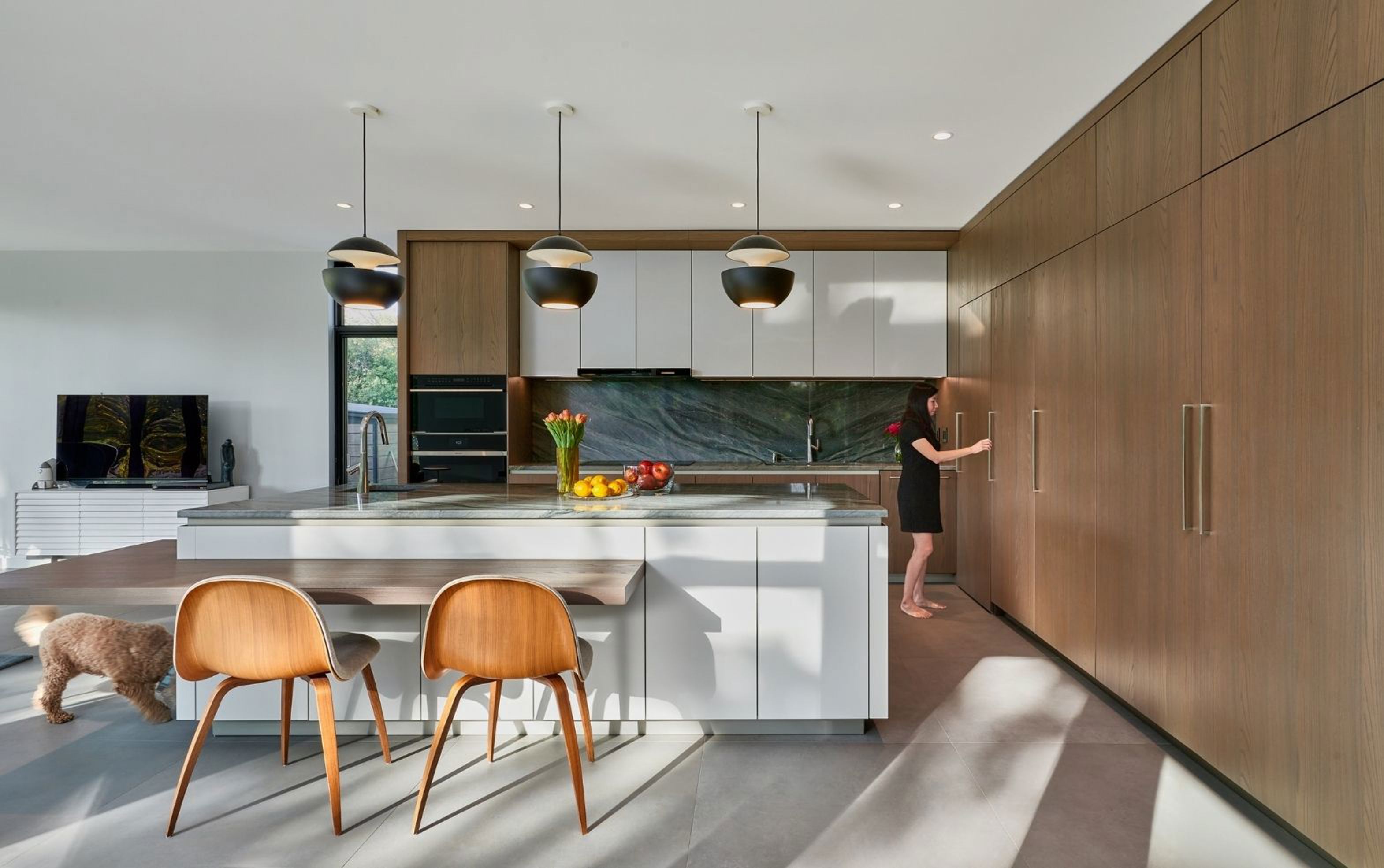 Appartamento luminoso alla Garbatella, riletto nel segno della memoria e della leggerezza, dove tracce originali e interventi contemporanei convivono in equilibrio. La cucina è separata dall’ingresso da una vetrata in ferro e vetro.